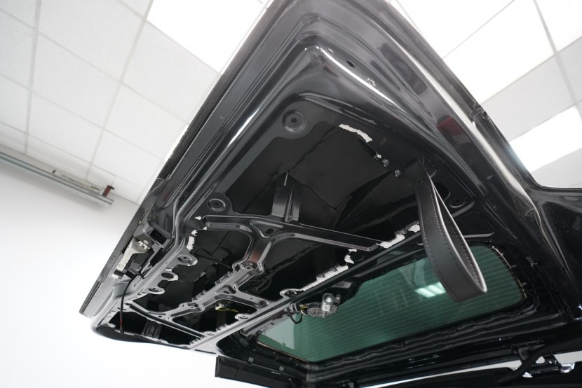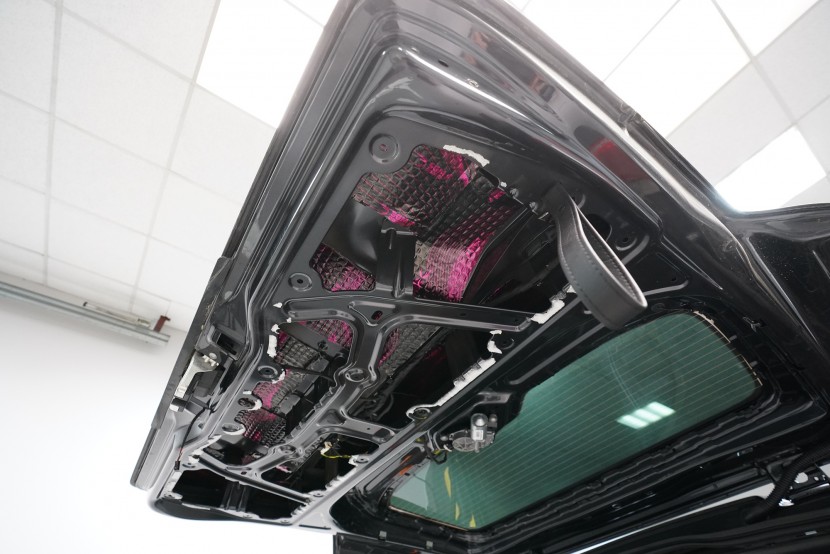 Věnujeme se samozřejmě i pátým dveřím, aby odhlučnění zadní části vozu bylo kompletní. Jako první vrstvu volíme lehký antivibrační materiál SGM Air 2 o tloušťce 2,3 mm, který zamezí vibracím a nezatěžuje páté dveře zbytečnou hmotností. Z tohoto důvodu se jedná o jedinou oblast, kde lepíme antivibrační materiál bodově a spotřebujeme vždy pouze 1 kus materiálu.