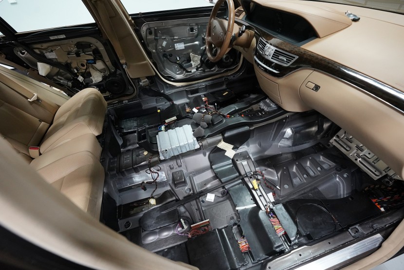 Odhlučnění luxusního vozu Mercedes-Benz třídy S. Tato instalace je typickým příkladem toho, že i ty nejluxusnější modely prémiových automobilek nedisponují odhlučněním, které jejich klienti očekávají. I majitel tohoto vozu nebyl spokojen zejména s hlukem od podběhů a spodní části vozu, který způsobují především pneumatiky velkých kol této limuzíny. Tyto problémy nejlépe řeší náš balíček odhlučnění Premium Plus, který je zaměřen mimojiné právě na maximální odhlučnění podlahy a předních i zadních podběhů. Konkrétně tedy odhlučňujeme přední, zadní i páté dveře, podlahu, zavazadlový prostor, přední a zadní podběhy z vnitřní strany a kapotu. Tento vůz je velmi náročný na rozložení a složení interiéru, je nutná maximální pečlivost a samozřejmě dlouhá praxe. Vzhledem k náročnosti odhlučnění tohoto typu vozu je doba strávená na autě oproti standardním vozům navýšena, přesto instalaci zvládneme během jednoho pracovního dne, což je podmínka většiny našich zákazníků. Více informací se dozvíte v naší podrobné fotoreportáži.