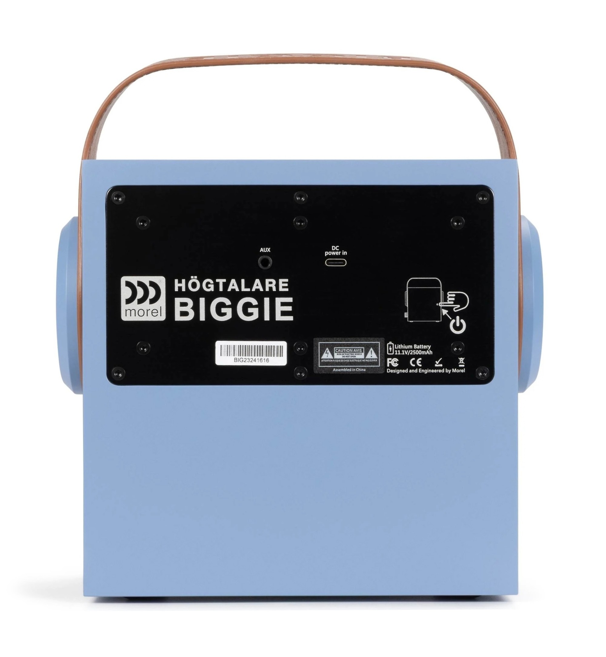 Design reproduktoru Biggie kombinuje minimalistickou estetiku s praktickými detaily. Kompaktní čtvercový tvar navazuje na design modelu Högtalare, tentokrát však v menším a snadno přenosném provedení. Rukojeť s povrchem připomínajícím kůži (animal-friendly) usnadňuje přenášení a lze ji také odejmout. Biggie je dostupný v široké škále barevných variant, které umožňují sladit reproduktor s interiérem nebo osobním stylem. K dispozici jsou varianty v černé, bílé, červené, tmavě modré, zlatavě žluté, světle modré, olivově zelené a tyrkysové barvě, pro milovníky přírodních materiálů je dostupná také elegantní verze s dubovým povrchem.