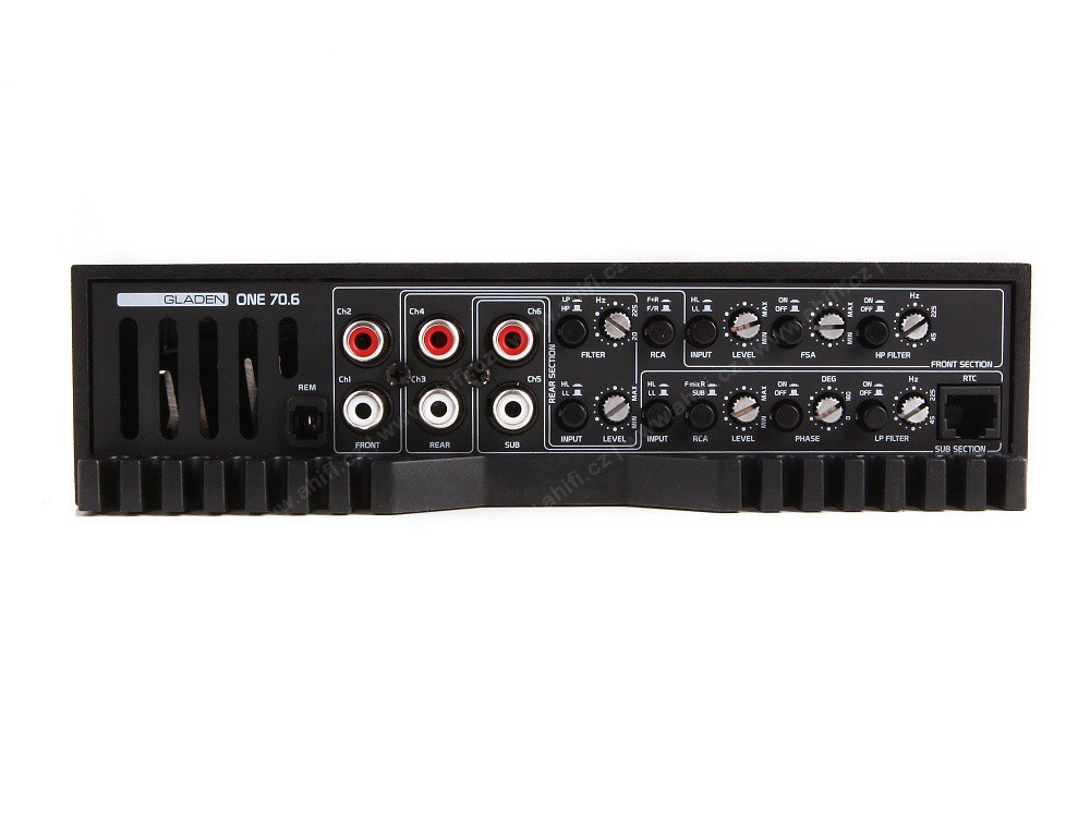 6kanálový, 4 x 70 na 4 Ω / 4 x 100 W RMS na 2 Ω, třída A, vysokoúrovňový vstup