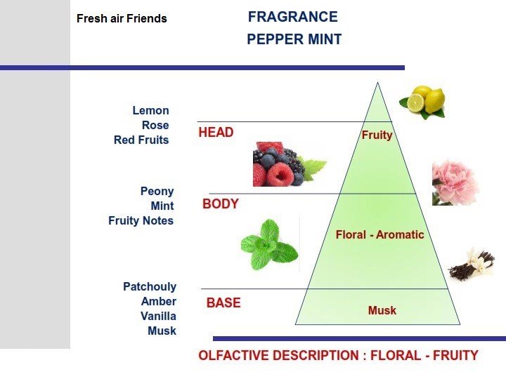 Cesare je osvěžovač vzduchu pro automobily, který obsahuje agresivní molekuly, které dokáží dlouho bojovat proti zákeřným bakteriím, které způsobují zápach. Vůně bergamotu, grapefruitu a pepře přecházející do svěží vůně máty peprné. Silná vůně dřeva Gayac, jantaru a vanilky. Taková je vůně Pepper Mint (peprmint). Panáček Cesare z kolekce oblíbených panáčků Fresh Air Friends od Mr&Mrs Fragrance je ideální parťák na provonění interiéru vašeho auta.Panáček do ventilace Mr&Mrs Fragrance z řady CESARE