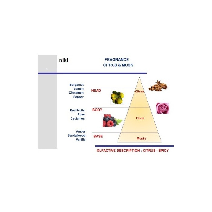 Za pomoci univerzálního funkčního klipu připevníte vůni (vertikálně nebo horizontálně) na větrací otvory (vývod klimatizace) každého auta. Vůně do auta pak za pomoci proudícího vzduchu rozvádí stálou a dlouhotrvající vůni. Můžete použít EVA náplň napuštěnou aroma olejem dle výběru, kterou můžete snadno nahradit novou náplní. Balení včetně iniciální náplně, kterou je možné kdykoliv vyměnit za jednu z 15 jiných alternativ. Vůně Citrus & Musk (citrus a mošus) je směs vybraných druhů ovoce a orientálního koření (bergamot, citron, pepř a skořice). Provoňte vaše auto s vůní Citrus & Musk!Vůně do ventilace Mr&Mrs Fragrance z řady Niki