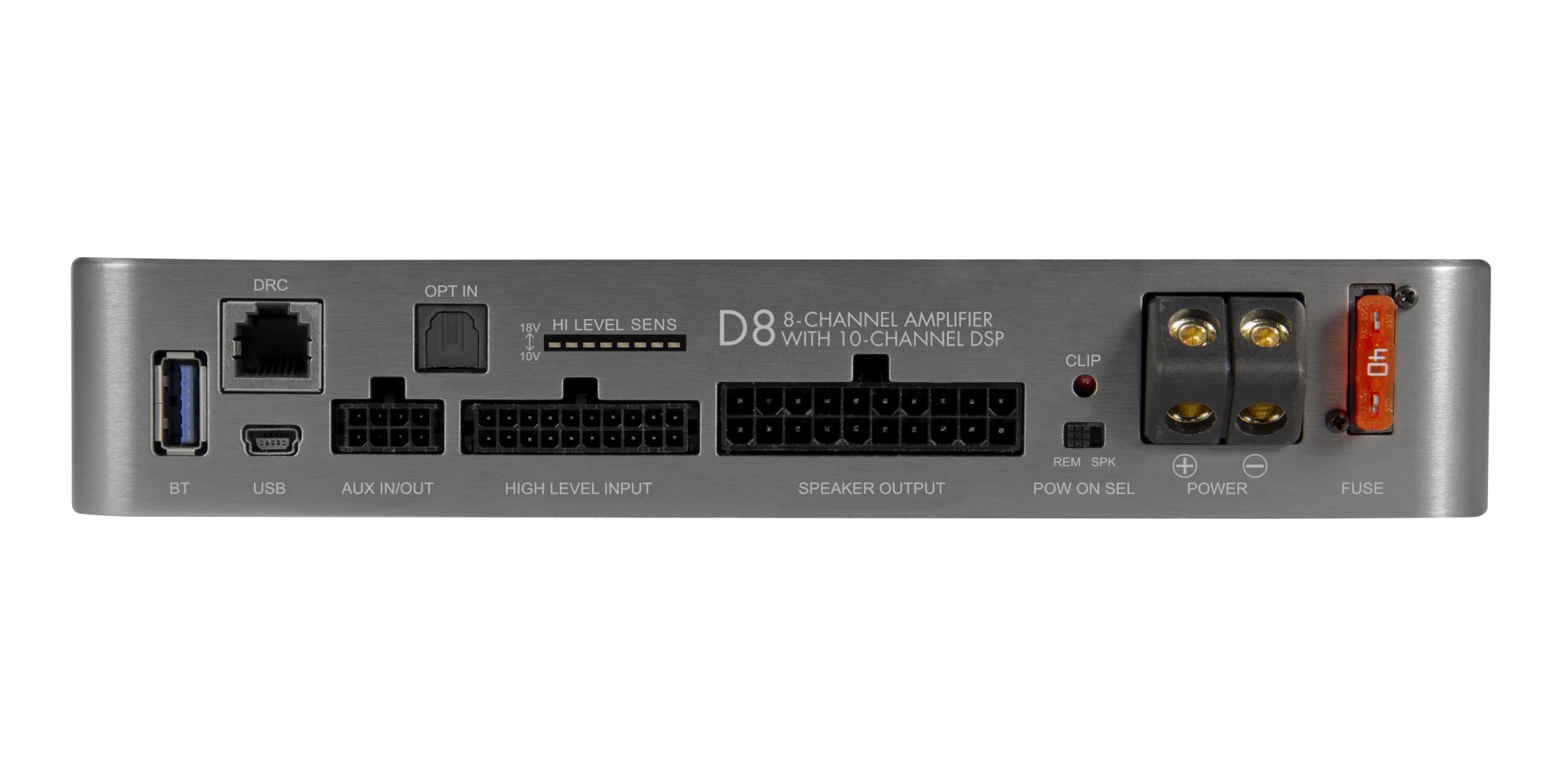 D8 je navržena jako univerzální DSP zesilovač pro široké spektrum instalací. Nabízí 8kanálové vysokourovňové vstupy s EPS®, které zvládají vstupní napětí až 18 V a umožňují přímé připojení k továrním autorádiím. K dispozici je také AUX vstup a optický digitální vstup pro kvalitní digitální přenos signálu. Automatické zapnutí při detekci signálu umožňuje instalaci bez REM vodiče, zatímco EPS® eliminuje chybová hlášení vozidla a zajišťuje bezproblémový provoz i v moderních automobilech.