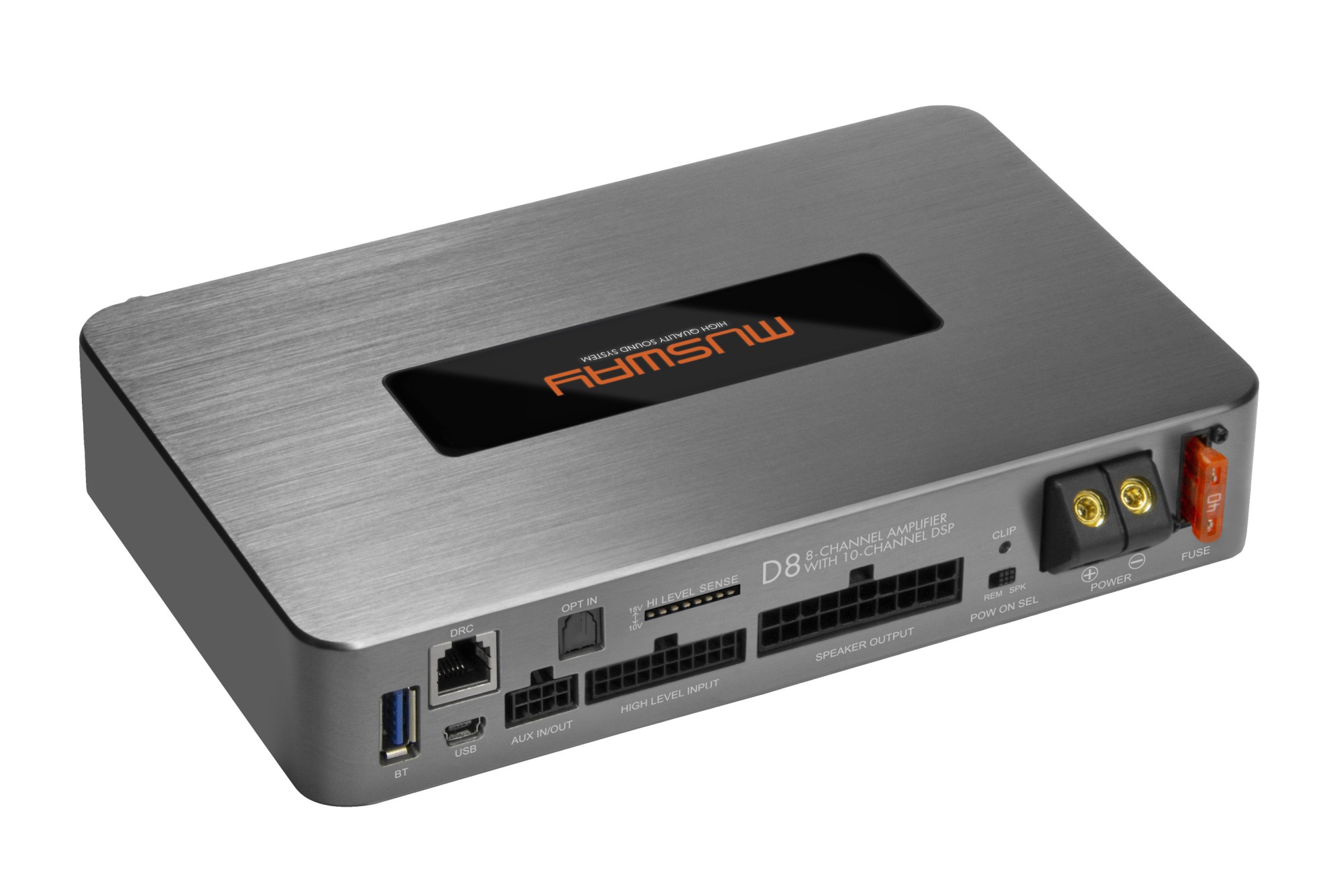 Musway D8v4 je extrémně kompaktní 8kanálový zesilovač s integrovaným DSP procesorem, který představuje ideální řešení pro instalace s omezeným prostorem, kde je kladen důraz na kombinaci výkonu, flexibility a jednoduché integrace. Oproti klasickým DSP zesilovačům zaujme především svými minimálními rozměry, díky kterým jej lze umístit i do velmi stísněných prostor, aniž by bylo nutné dělat kompromisy ve výkonu nebo funkčnosti. Nejnovější generace přináší výrazné navýšení výkonu při zachování kompaktního šasi, což bylo dosaženo použitím moderních výkonových čipů a optimalizací celé konstrukce. Samozřejmostí je plná kompatibilita s moderními vozidly včetně vysokourovňových vstupů s EPS®, automatického zapnutí a široké konektivity.