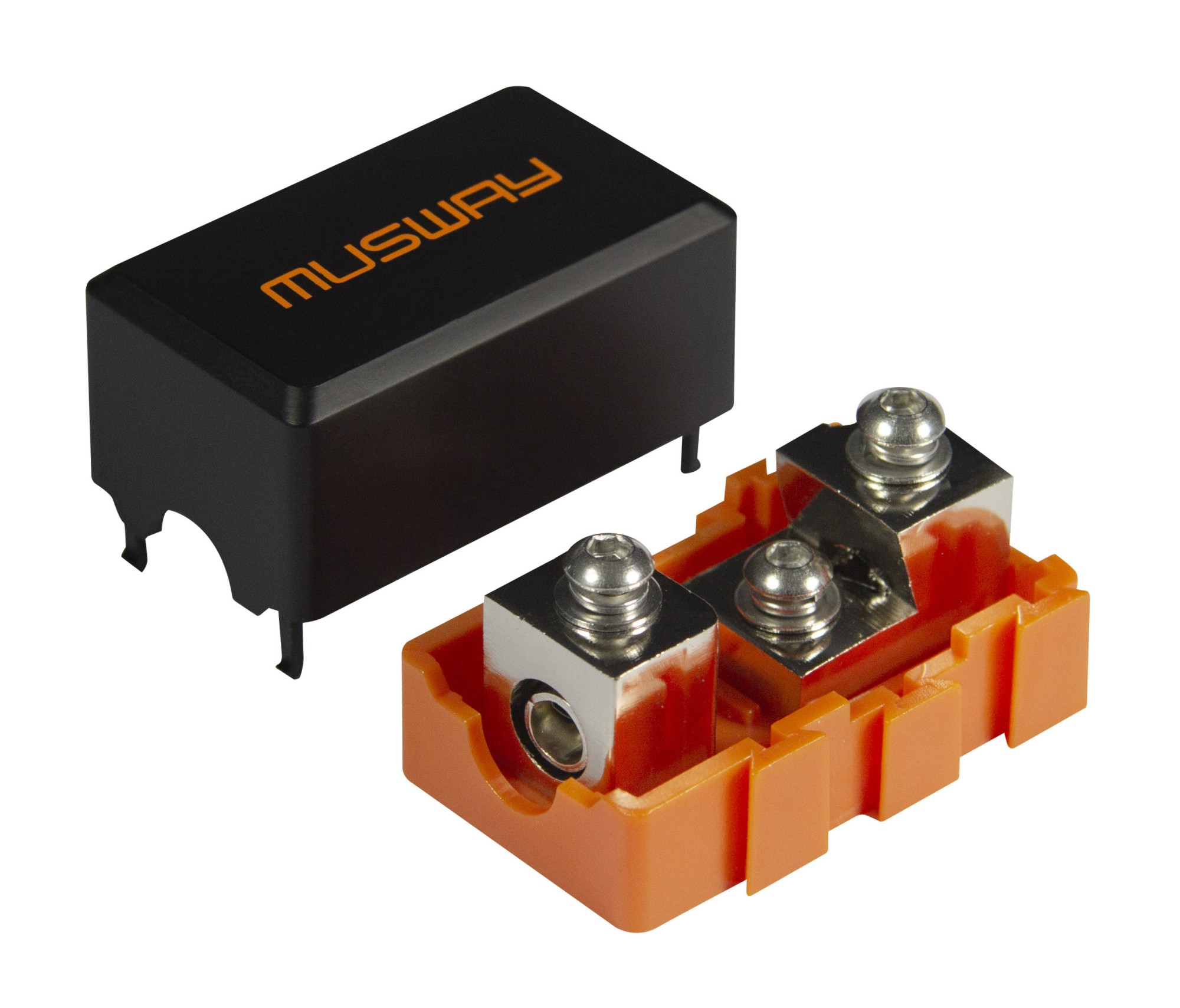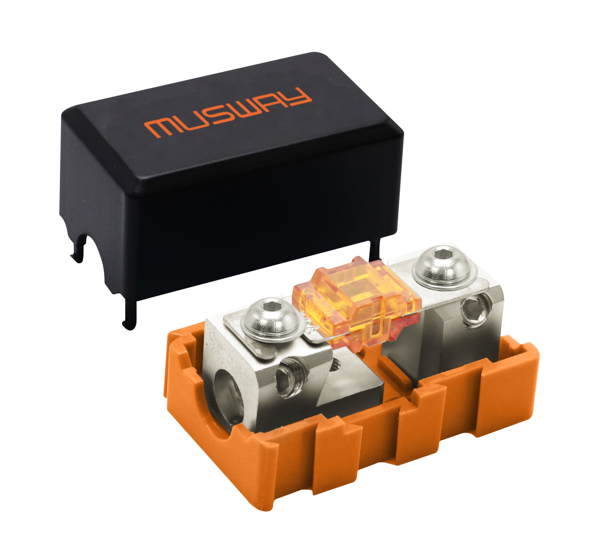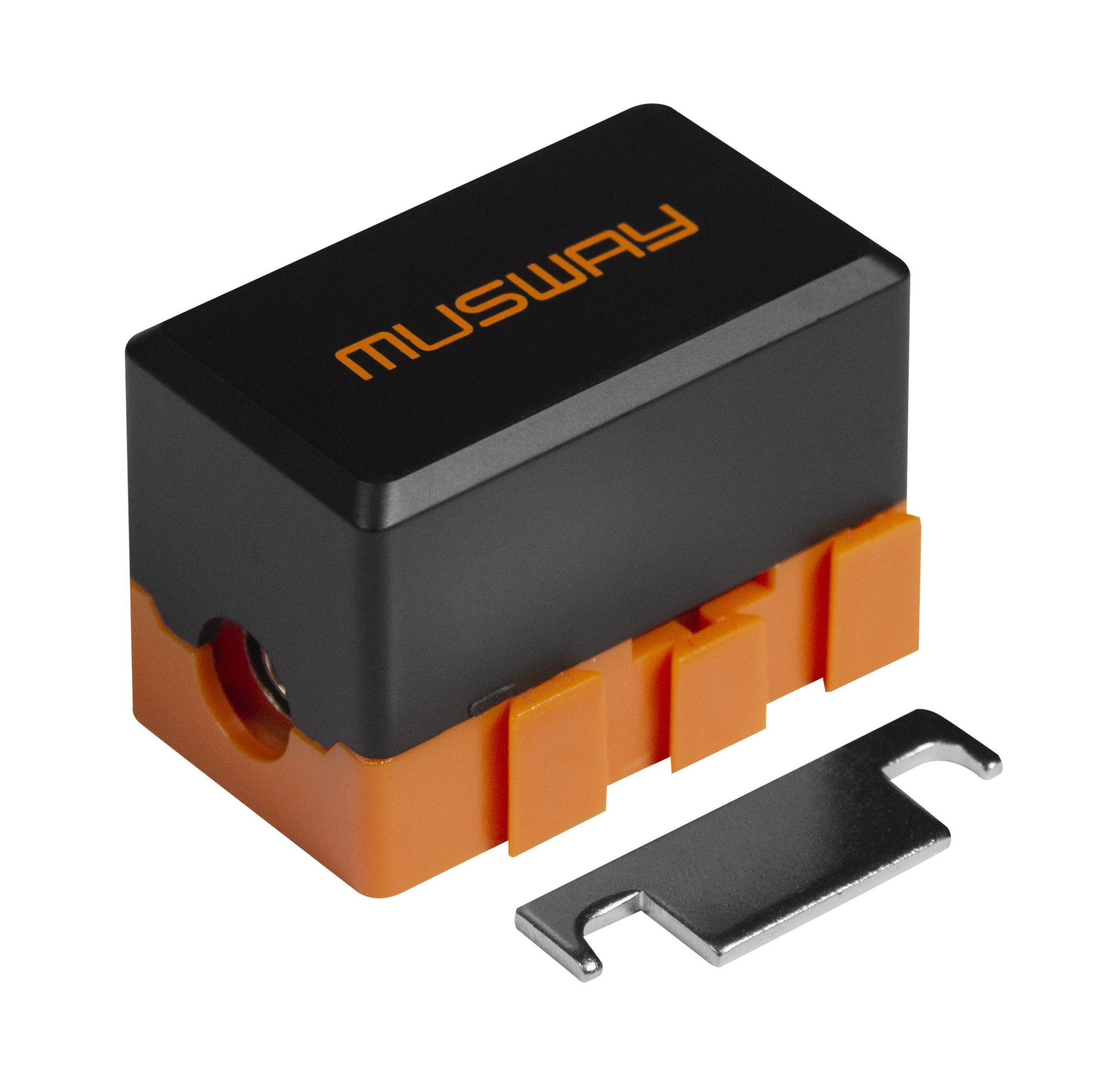 Musway MFB100 je kompaktní a modulární pojistkové pouzdro určené pro bezpečné napájení audio systémů v automobilu. Díky patentovanému modulárnímu systému jej lze použít nejen jako klasický inline držák pojistky, ale také jako stavební prvek pro vytvoření rozbočovacího bloku, pojistkové distribuce nebo napájecího uzlu. Jednotlivé moduly lze jednoduše propojit pomocí přiložených propojek a přizpůsobit tak instalaci konkrétním požadavkům. MFB100 je vhodný pro kabely až do průřezu 20 mm² a představuje praktické a flexibilní řešení pro menší i složitější instalace.