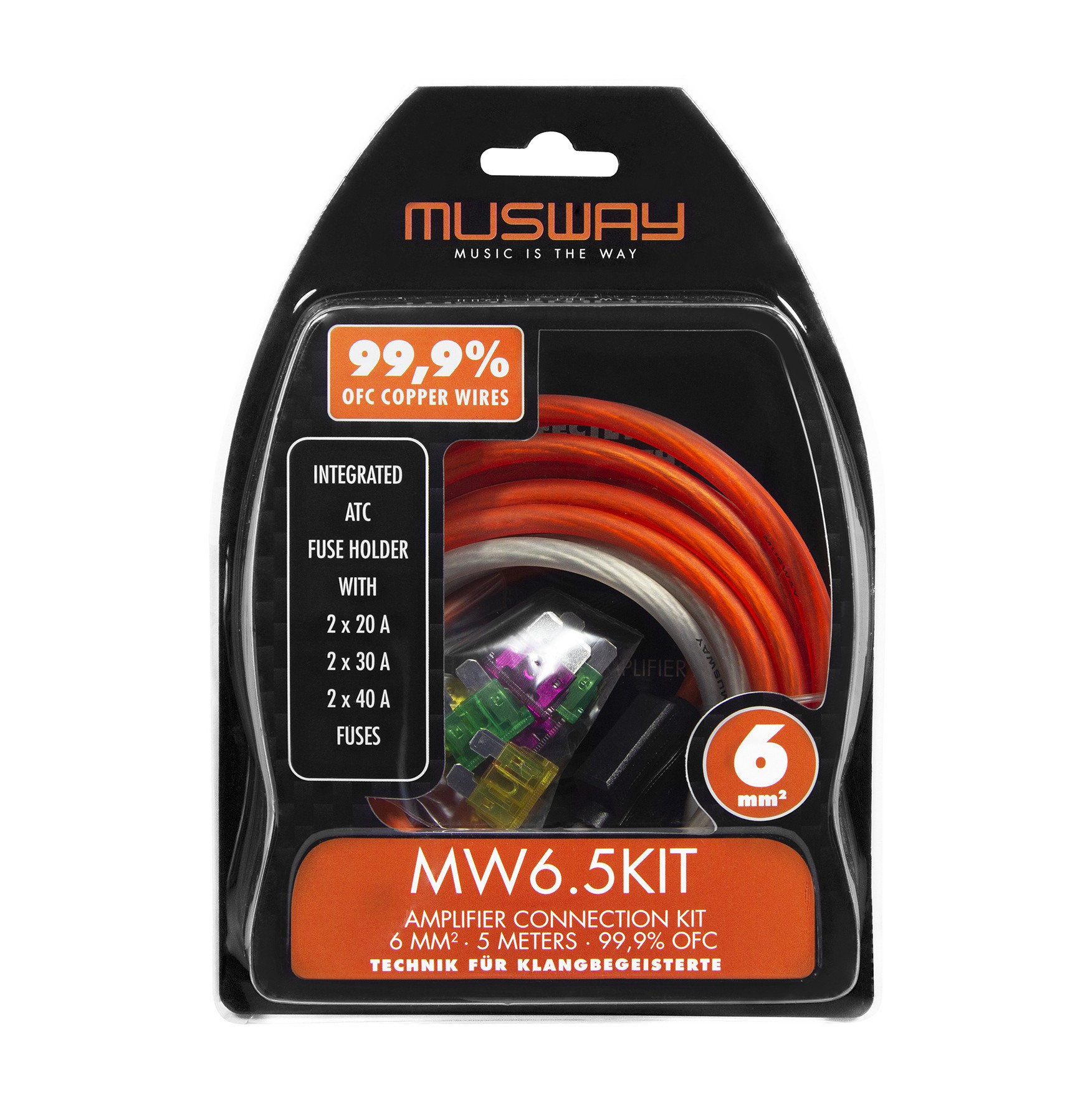 Musway MW6.5KIT je kvalitní instalační kabelová sada určená pro připojení zesilovače, která využívá vodiče z plnohodnotné mědi (99,9 % OFC). Na rozdíl od běžných sad na trhu, které často používají hliníkové vodiče s měděným povlakem (CCA), nabízí tato sada výrazně vyšší vodivost, nižší ztráty a stabilnější napájení zesilovače. Díky tomu je ideální pro výkonnější audio systémy, kde je kvalita napájení klíčová pro dosažení maximálního výkonu i zvukové kvality. Kabely jsou již osazeny lisovanými očky pro snadnou instalaci a součástí sady je také integrované pojistkové poudro s odpovídajícími pojistkami. Sada záměrně neobsahuje signálový RCA kabel, aby bylo možné zvolit ideální délku podle konkrétní instalace – Musway nabízí samostatné RCA kabely v délkách od 0,3 m až po 5 m.