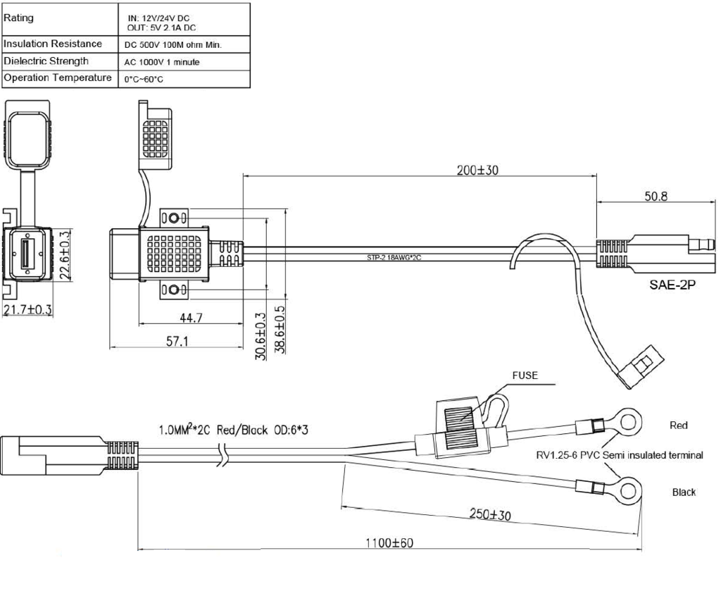 Nabíječka USB-A, 5 V, 2.1 A, voděodolná, integrovaná v montážním pouzdře.