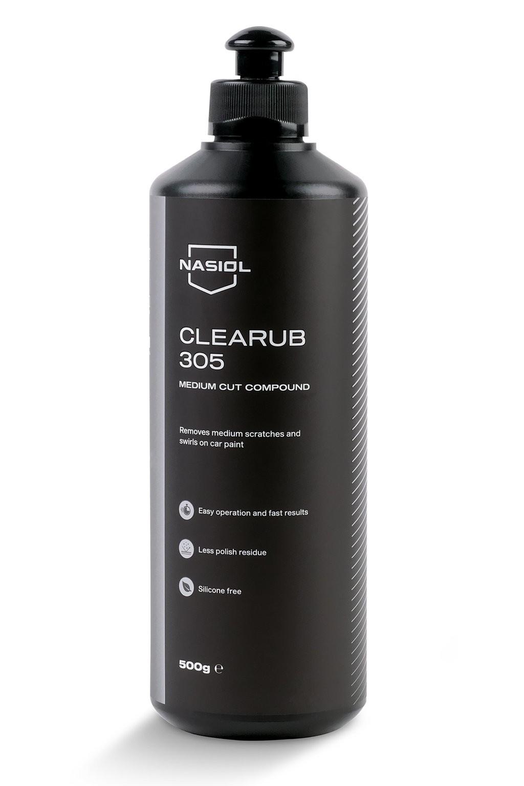 Nasiol CLEARUB 305-S je středně silná lešticí pasta navržená k odstranění středně hlubokých škrábanců. Připraví povrch pro nanášení nano keramické ochrany a je také ideální volbou pro dokončovací práce na odolných vrchních nátěrech a voscích. Zajistí efekt vysokého stupně lesku.