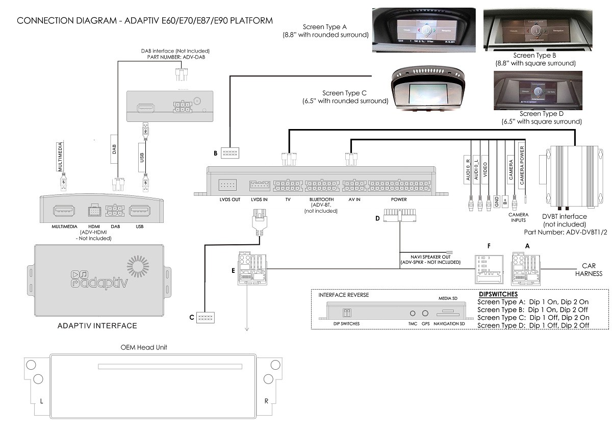 Adaptiv - elektronický modul, který umožňuje rozšíření stávajících jednotek s OEM monitorem o navigaci, přehrávání videa, vstup USB, iPhone, SD kartu, HDMI, AUX, připojení zadní parkovací kamery, DAB rádiového tuneru nebo DVB-T televize. Vše je ovládáno pomocí otočného ovladače BMW idrive.