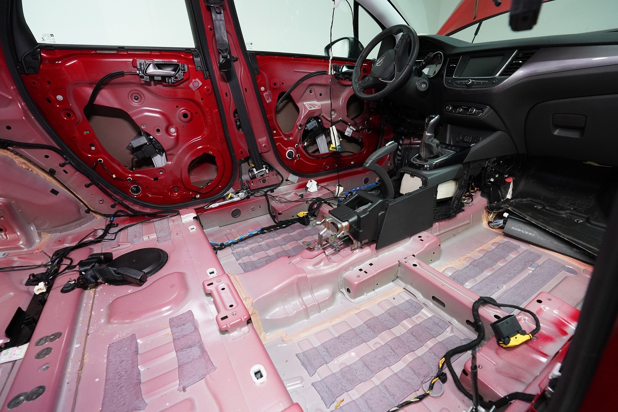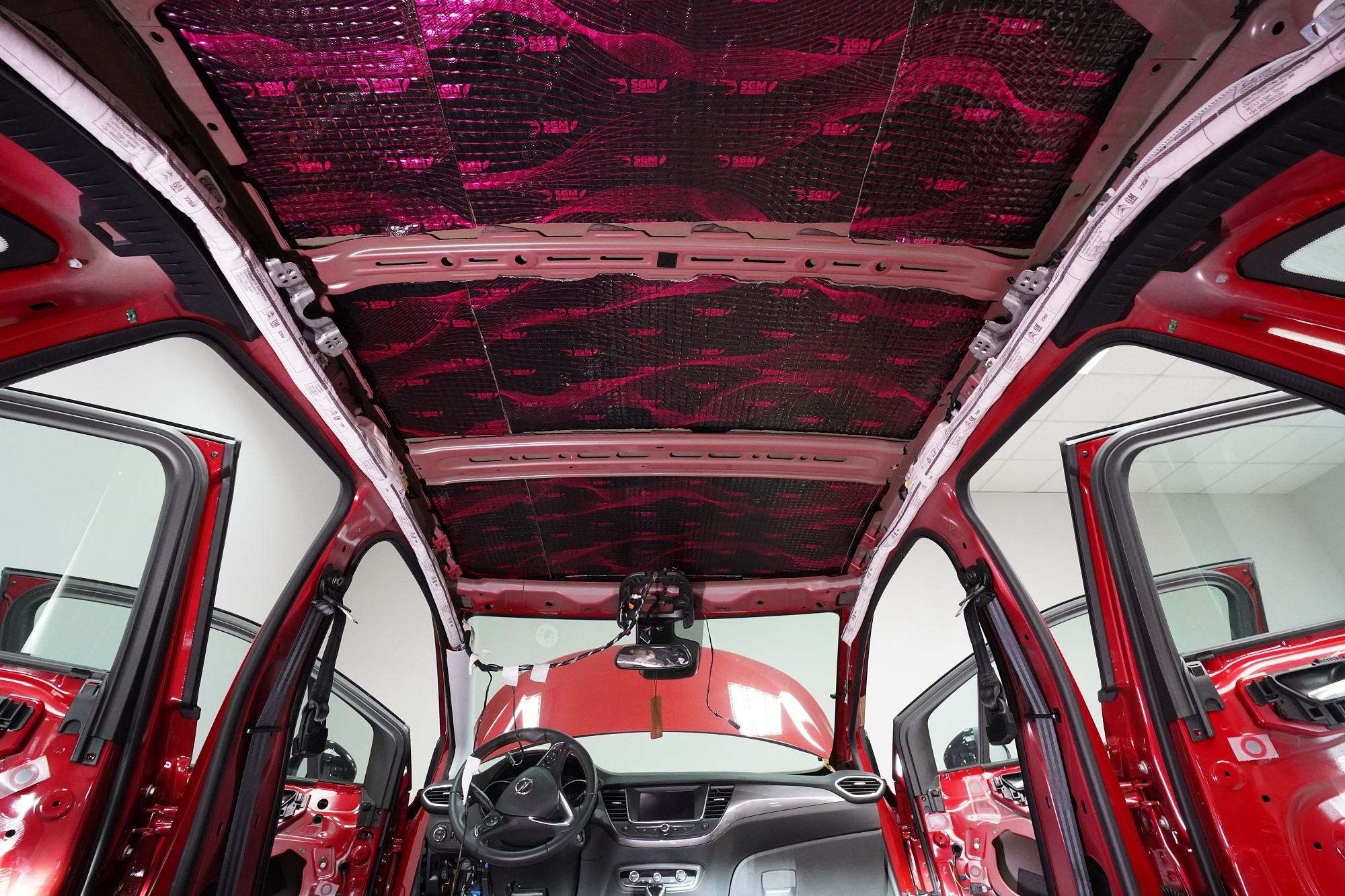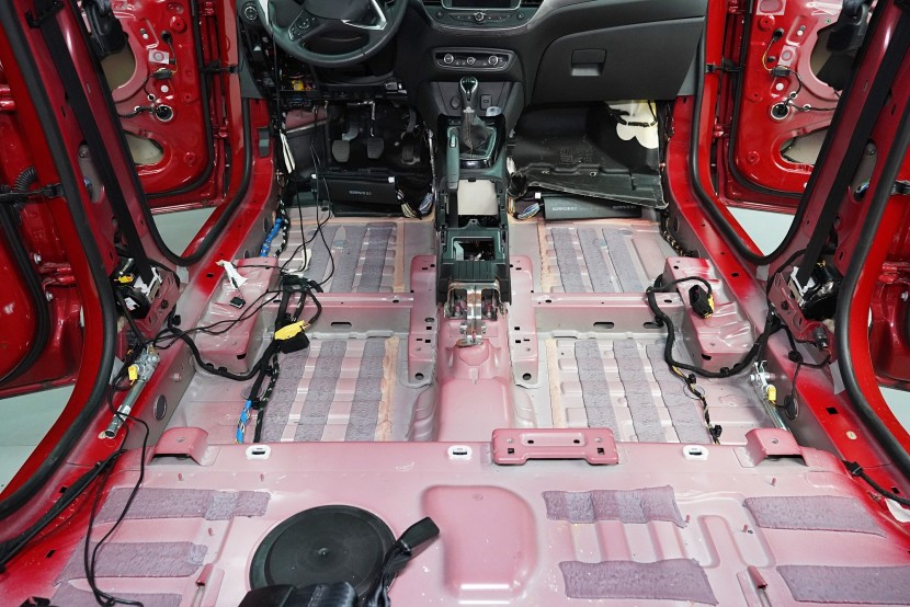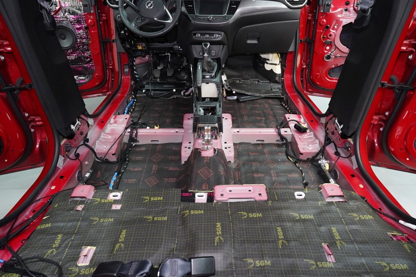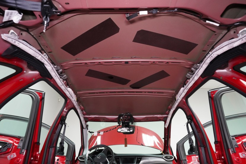 Odhlučnění vozu Opel Crossland v maximální možné konfiguraci. Tovární izolace tohoto malého crossoveru je tradičně na velmi nízké úrovni a ačkoliv můžete vidět zejména na podlaze bodovou ochranou proti vibracím, je to vzhledem ke zcela chybějící zvukové izolaci zcela nedostatečné. Vůz tak trpí poměrně výrazným hlukem pronikajícím přes přední a zadní podběhy, dveře, podlahu a také přes tenký plech střechy. S majitelem jsme se domluvili rovnou na našem nejúčinnějším odhlučnění v podobě balíčku Expert Plus. Zaměřili jsme se tedy na všechny zásadní oblasti vozu, konkrétně přední, zadní a páté dveře, podlahu, zavazadlový prostor včetně zadních podběhů, kapotu, přední podběhy, torpédo a střechu. Všechny oblasti jsme odhlučnili špičkovými antivibračními a zvukově izolačními materiály ruského výrobce SGM z nejvyšší řady Prime, která zaručuje vysokou účinnost i snadnou instalaci ve dvou vrstvách díky vícevrstvým membránovým materiálům nejnovější generace. Na odhlučnění pracují zároveň čtyři naši zkušení technici, kteří montáž zvládnou v rámci 1 pracovního dne.