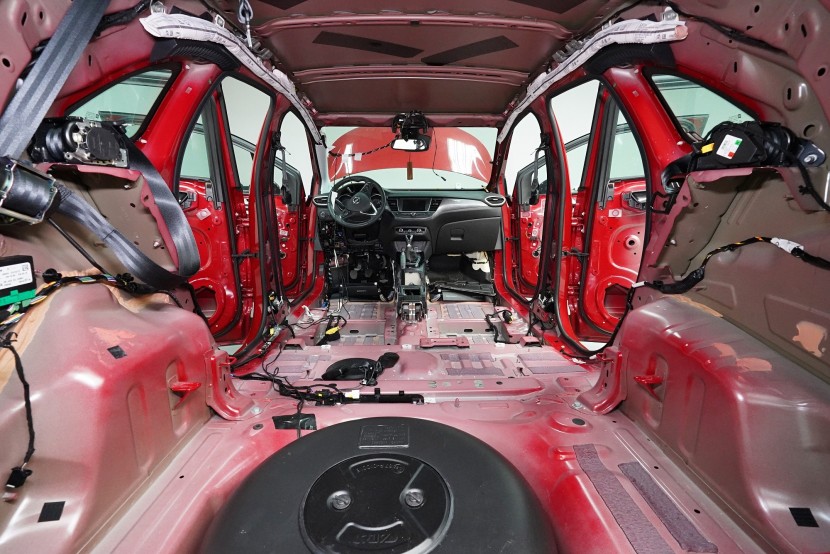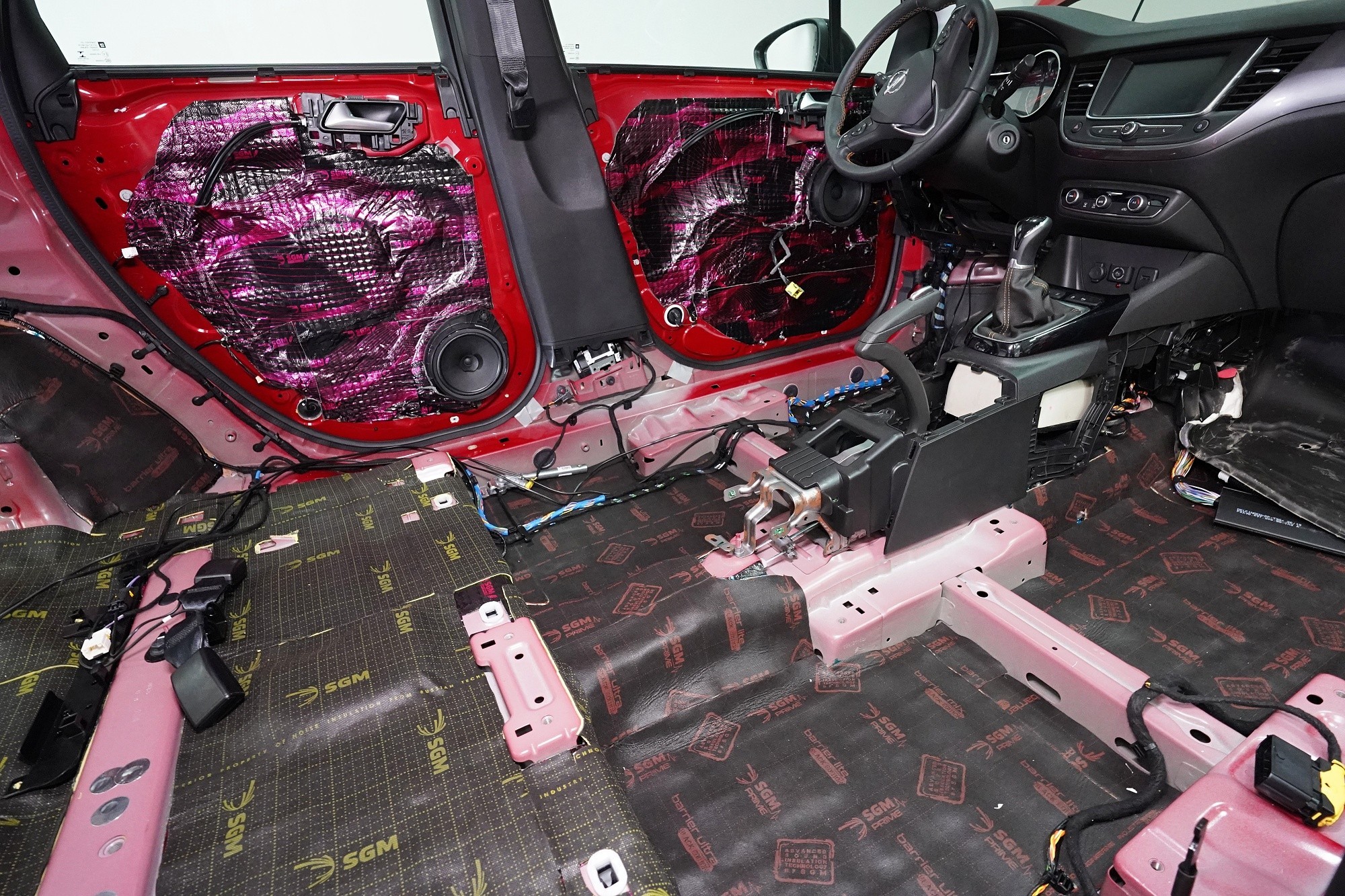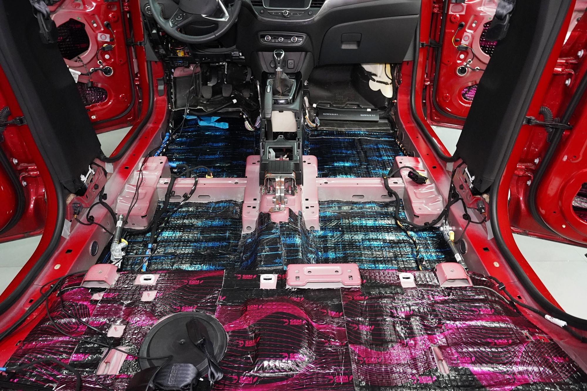 Odhlučnění vozu Opel Crossland v maximální možné konfiguraci. Tovární izolace tohoto malého crossoveru je tradičně na velmi nízké úrovni a ačkoliv můžete vidět zejména na podlaze bodovou ochranou proti vibracím, je to vzhledem ke zcela chybějící zvukové izolaci zcela nedostatečné. Vůz tak trpí poměrně výrazným hlukem pronikajícím přes přední a zadní podběhy, dveře, podlahu a také přes tenký plech střechy. S majitelem jsme se domluvili rovnou na našem nejúčinnějším odhlučnění v podobě balíčku Expert Plus. Zaměřili jsme se tedy na všechny zásadní oblasti vozu, konkrétně přední, zadní a páté dveře, podlahu, zavazadlový prostor včetně zadních podběhů, kapotu, přední podběhy, torpédo a střechu. Všechny oblasti jsme odhlučnili špičkovými antivibračními a zvukově izolačními materiály ruského výrobce SGM z nejvyšší řady Prime, která zaručuje vysokou účinnost i snadnou instalaci ve dvou vrstvách díky vícevrstvým membránovým materiálům nejnovější generace. Na odhlučnění pracují zároveň čtyři naši zkušení technici, kteří montáž zvládnou v rámci 1 pracovního dne.