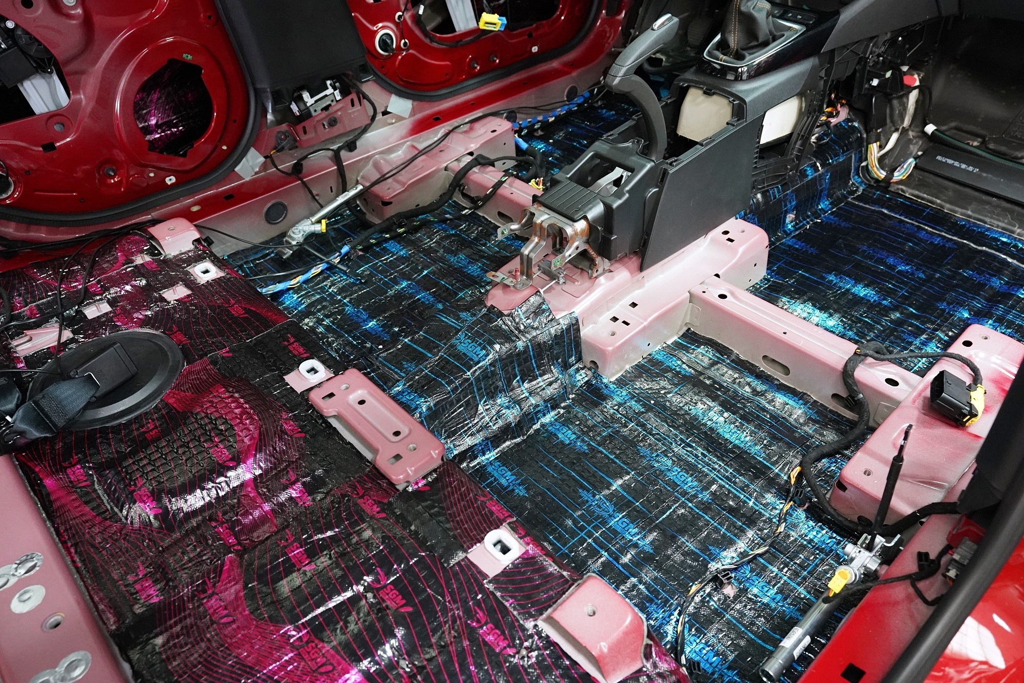 Podlaha je extrémně náchylná nejen na hluk, ale vzhledem k velké ploše i na výrazné vibrace od odrážejícího se hluku vozovky, od motoru, převodovky, pneumatik i výfukového systému. U balíčku Premium Plus volíme v první vrstvě jeden z nejúčinnějších materiálů na trhu o tloušťce 4 mm, konkrétně SGM Dual Prime s rekordním akustickým ztrátovým činitelem (MLF) o hodnotě 0,66 jednotek. Antivibrační materiál s těmito vlastnostmi dokáže účinně zamezit šíření vibrací a nízkofrekvenčního hluku a díky své flexibilitě jej není nutné nahřívat.