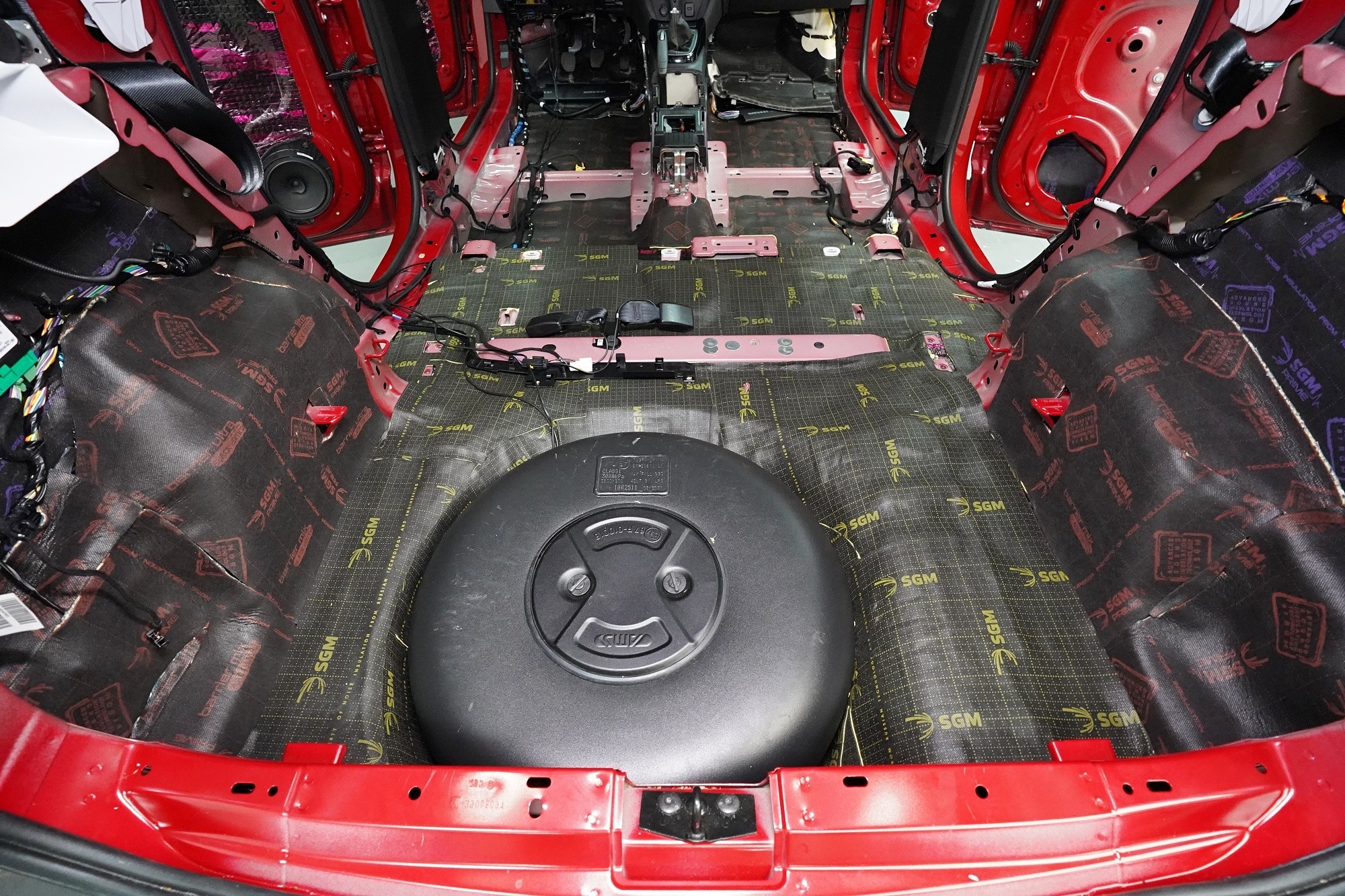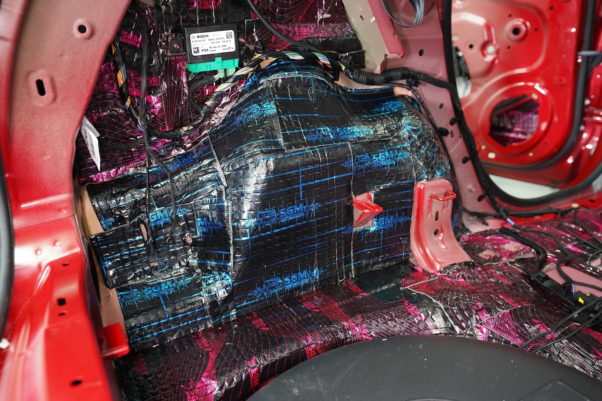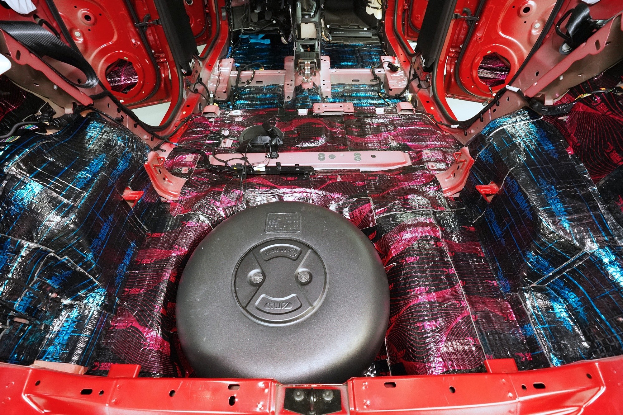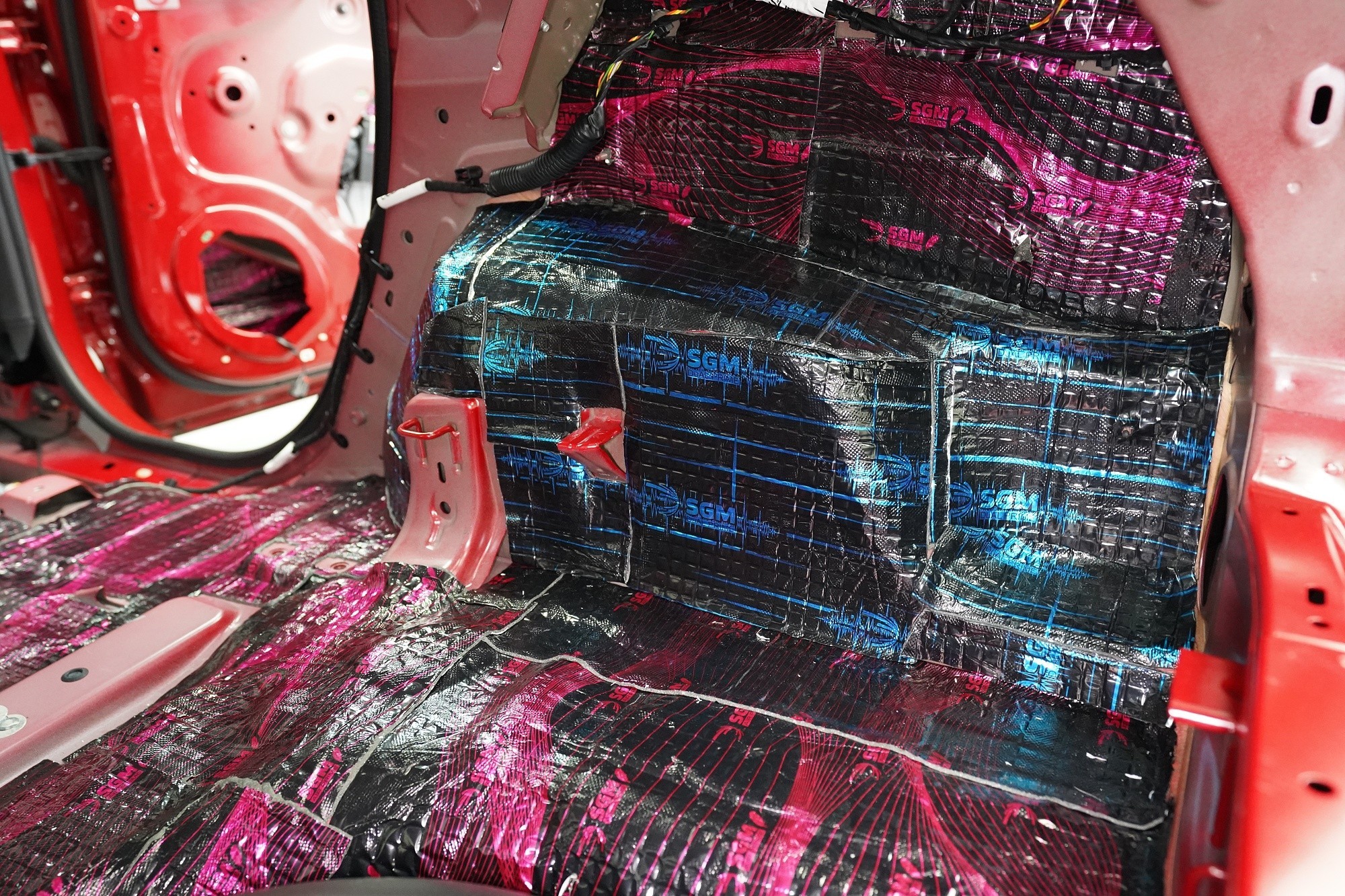 Na prostor pod zadními sedačkami aplikujeme odlehčený antivibrační materiál SGM Air 3 o tloušťce 3 mm a taktéž s velmi vysokým MLF o hodnotě 0,42 jednotek. I Air vyniká vysokou flexibilitou a snadnou aplikací bez nahřívání. Důležitým bonusem je velmi nízká hmotnost, díky speciálnímu složení materiálu.