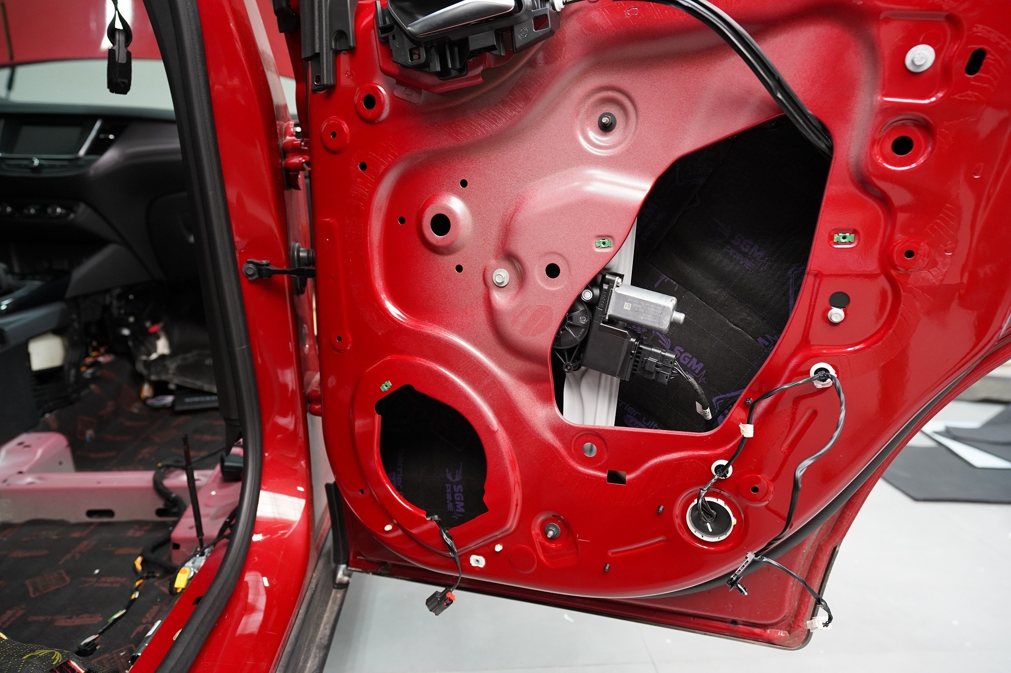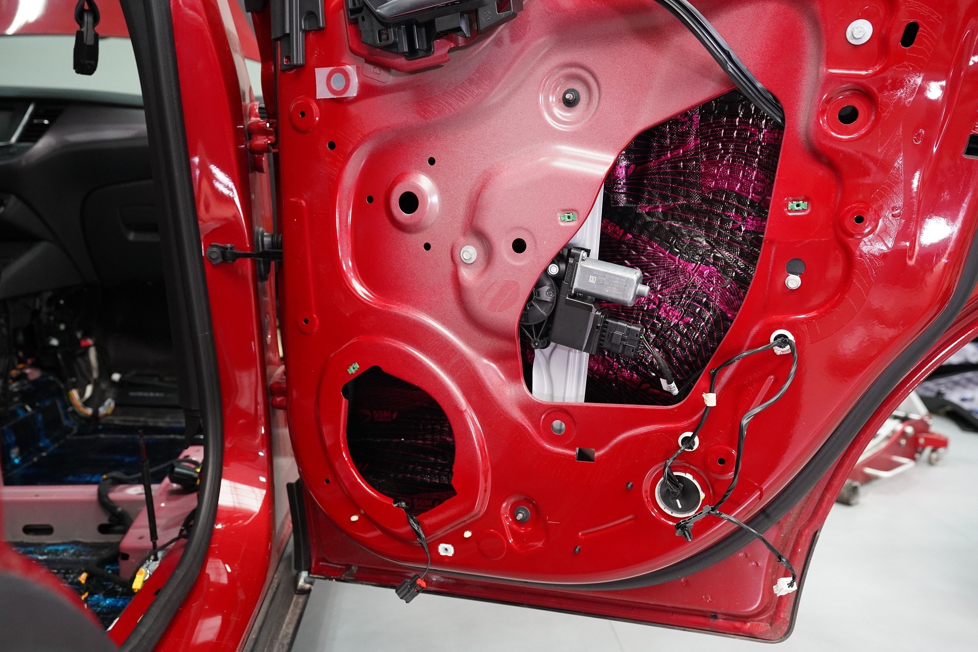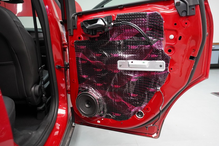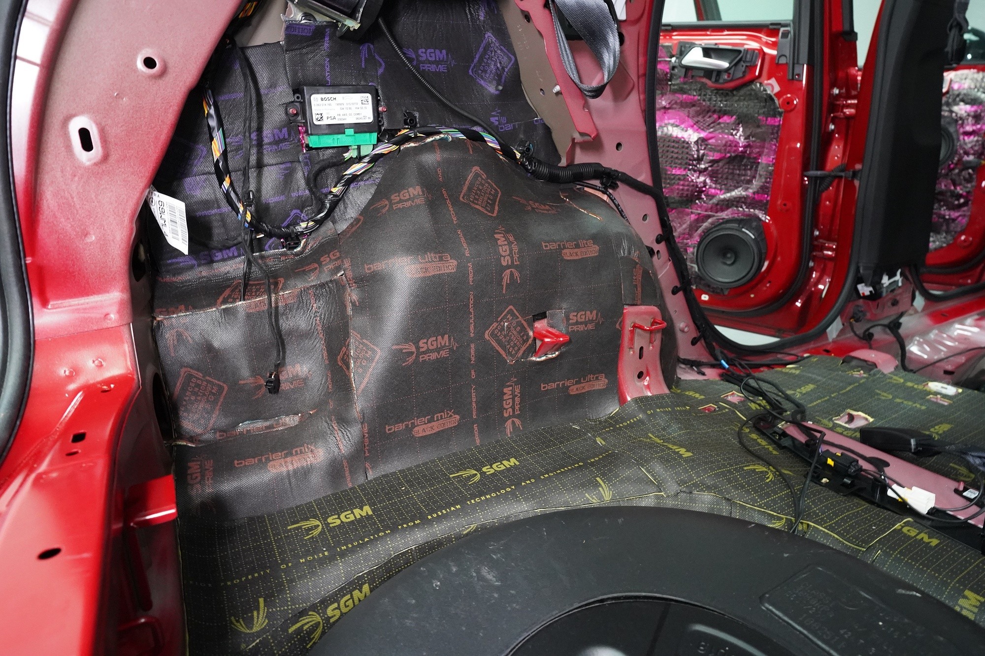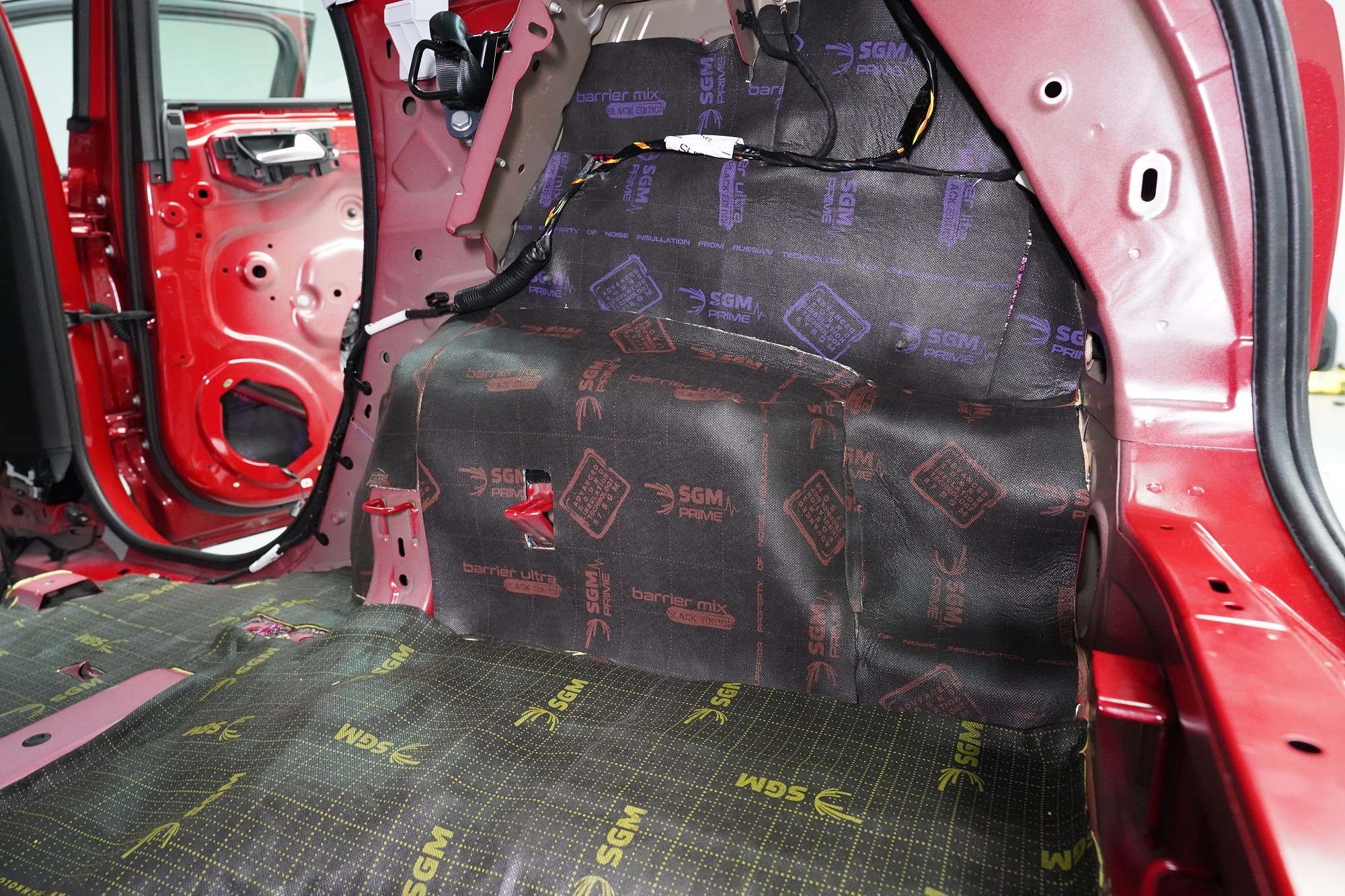 Blatníky jsou opatřeny lehkým membránovým materiálem SGM Barrier Lite momentálně v černo-fialové barvě v limitované Black Edition, který v dalším kroku najdete i ve dveřích. A na podběhy, které jsou nejvíce zatížené hlukem i vibracemi, lepíme ve druhé vrstvě jeden z nejúčinnějších materiálů na trhu SGM Barrier Mix, který poskytuje zvukovou izolaci až 35 dB a disponuje tloušťkou 6 mm. Díky své 2 mm silné protihlukové membráně nahrazuje druhou i třetí vrstvu odhlučnění a výrazně tak usnadňuje aplikaci.