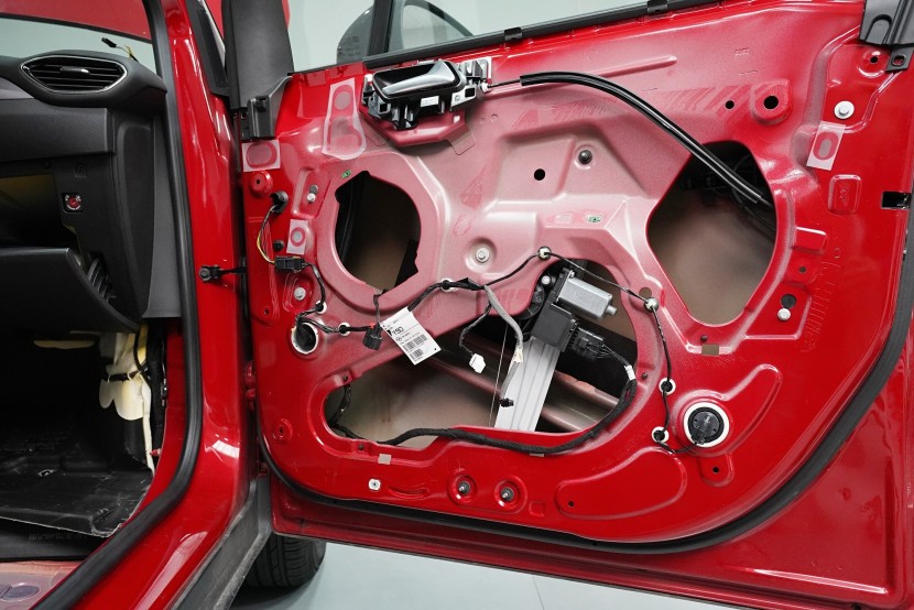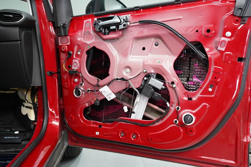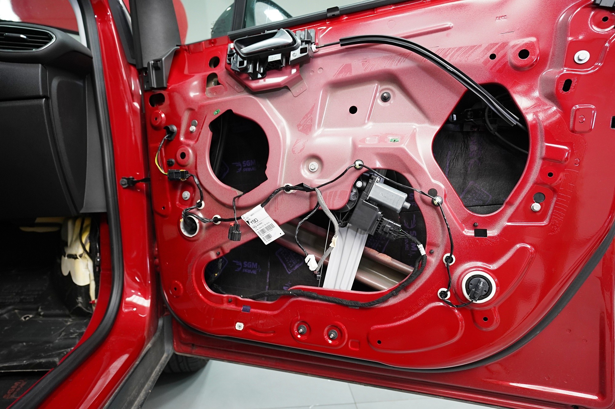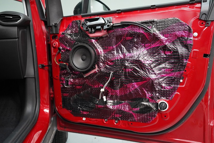 I páté dveře opatřujeme poslední vrstvou, kterou je materiál SGM Violon Wave o tloušťce 15 mm. Tato flexibilní pěna s tvarovou pamětí se lepí na plastové čalounění dveří z důvodu zamezení skřípání a vrzání nejen plastů, ale i drátů a dalších komponent uvnitř dveří a dodatečně i sníží hluk této oblasti.