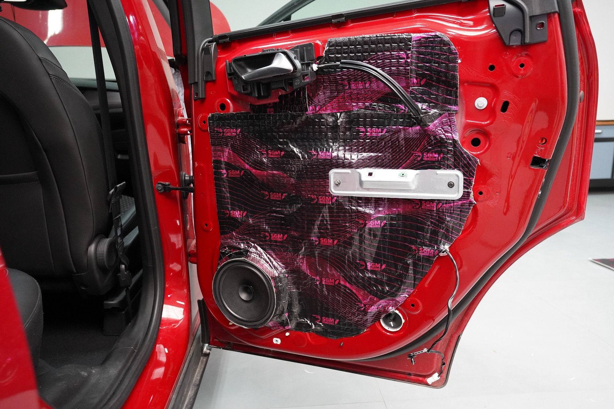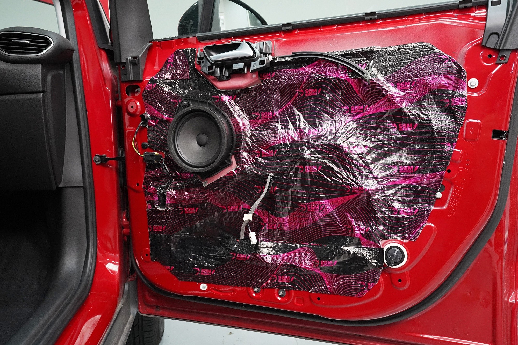 V rámci balíčku Expert Plus volíme jako první vrstvu při odhlučnění dveří antivibrační materiál SGM Air 3 o tloušťce 3 mm a MLF 0,42 jednotek. Ten s přehledem zlikviduje vibrace, zamezí pronikání nízkofrekvenčního hluku a zpevní velmi tenký plech dveří. I přes tloušťku 3 mm materiál disponuje velmi nízkou hmotností, je samozřejmě voděodolný a má mimo jiné antikorozní vlastnosti.