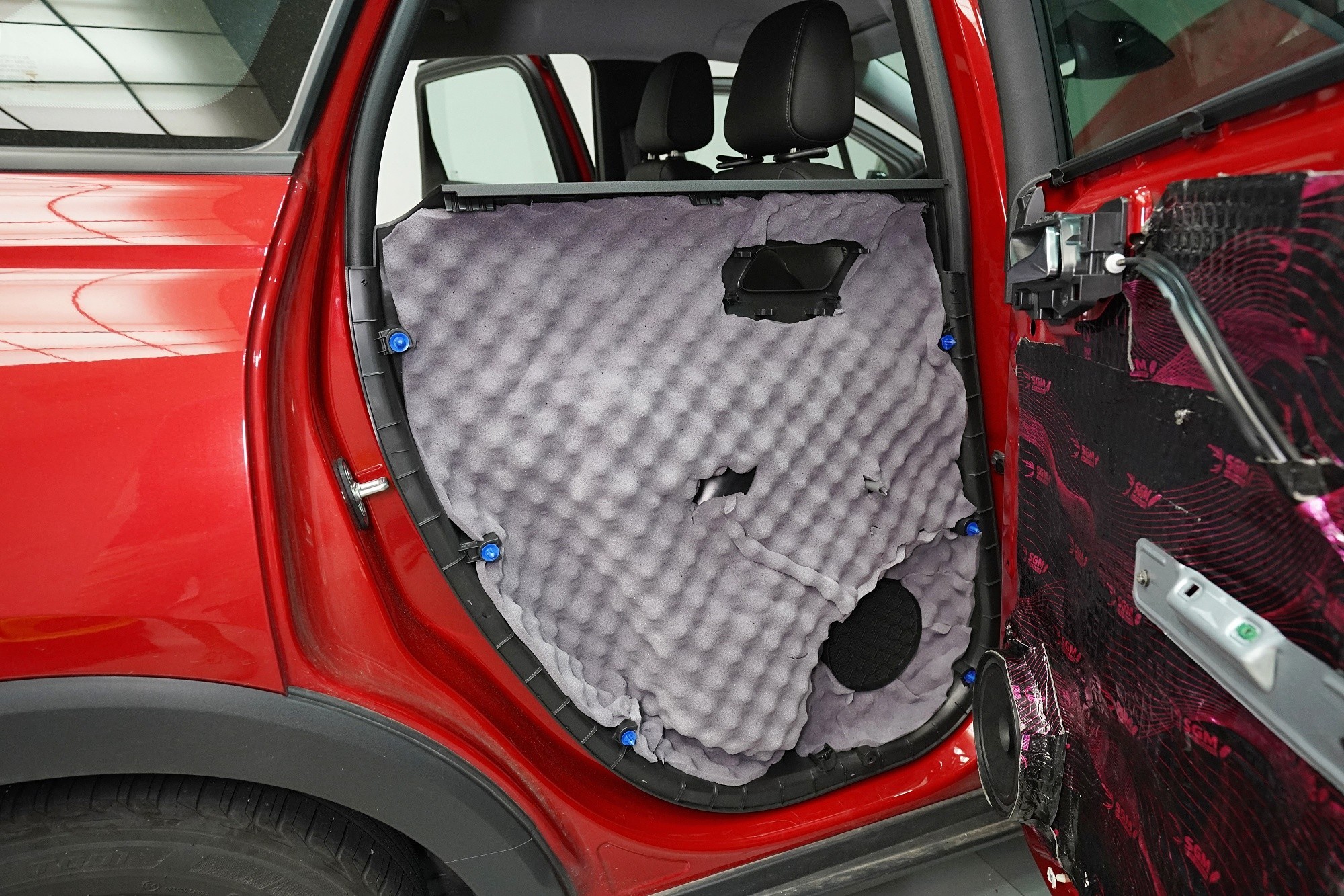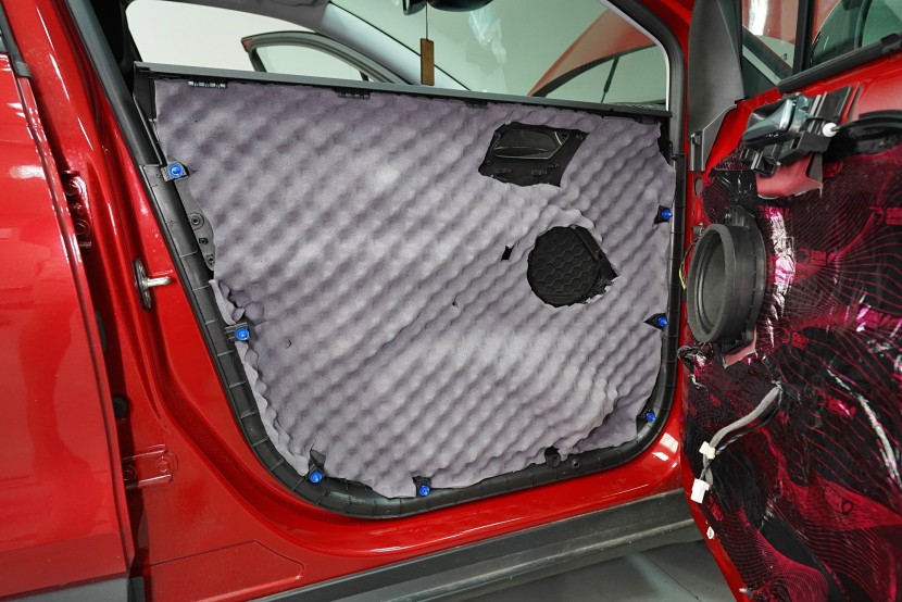Plastové výplně předních, zadních i pátých dveří opatřujeme poslední vrstvou, kterou je materiál SGM Violon Wave o tloušťce 15 mm. Tato flexibilní pěna s tvarovou pamětí se lepí na plastové čalounění dveří z důvodu zamezení skřípání a vrzání nejen plastů, ale i drátů a dalších komponent uvnitř dveří a dodatečně i sníží hluk této oblasti.