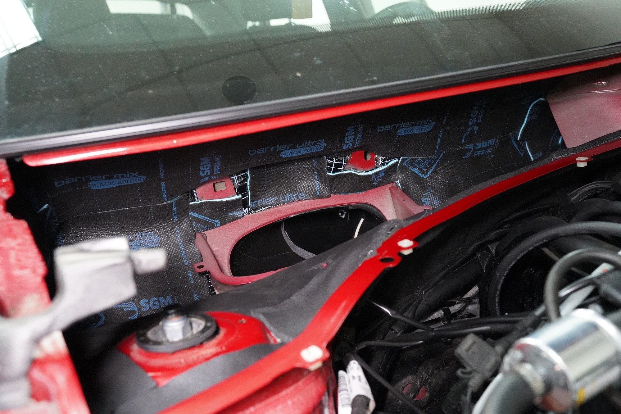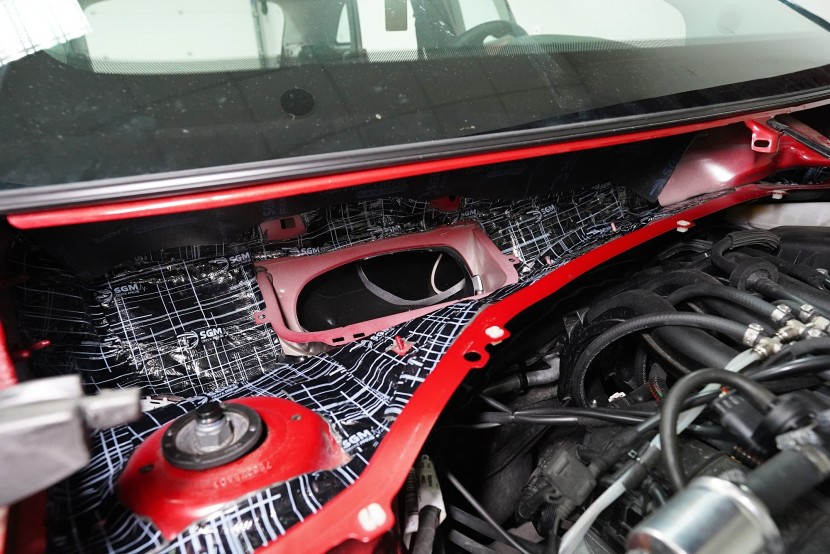 Také odhlučnění torpéda může přinést zajímavé výsledky. Stěrače jsou zdrojem silných vzduchových turbulencí a prostor pod spodním okrajem čelního skla je často veliký. Vytváří se zde efekt zvuku v jeskyni a to v bezprostřední blízkosti interiéru. Druhým důvodem k odhlučnění torpéda je snížení hluku od motoru. Nejprve tradičně aplikujeme antivibrační materiál, konkrétně SGM Onyx 3, který odfiltruje silné vibrace motoru.