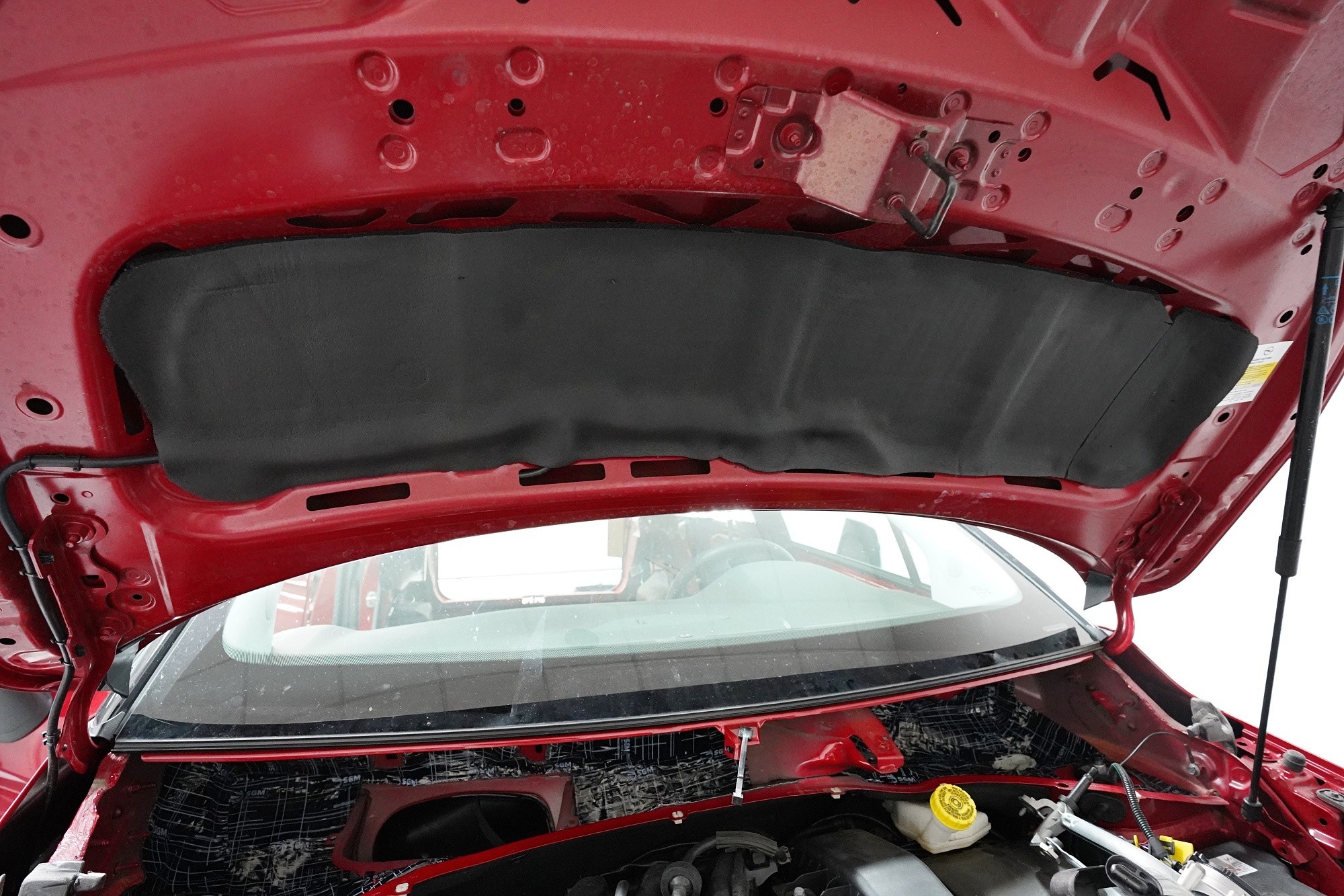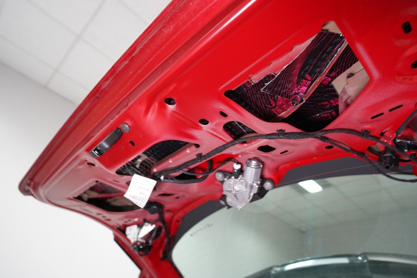 Nezapomínáme ani na kapotu, na kterou v první vrstvě aplikujeme lehký antivibrační materiál SGM Air 2. Tím kapotu zpevníme, zamezíme vibracím, které se přenáší do dalších částí vozu a zmizí i typický plechový zvuk při zavření kapoty. Následně aplikujeme zvukově i tepelně izolační materiál SGM R-Ton, který sníží hluk motoru a to při zachování původního vzhledu motorového prostoru.