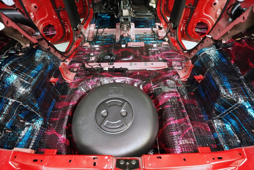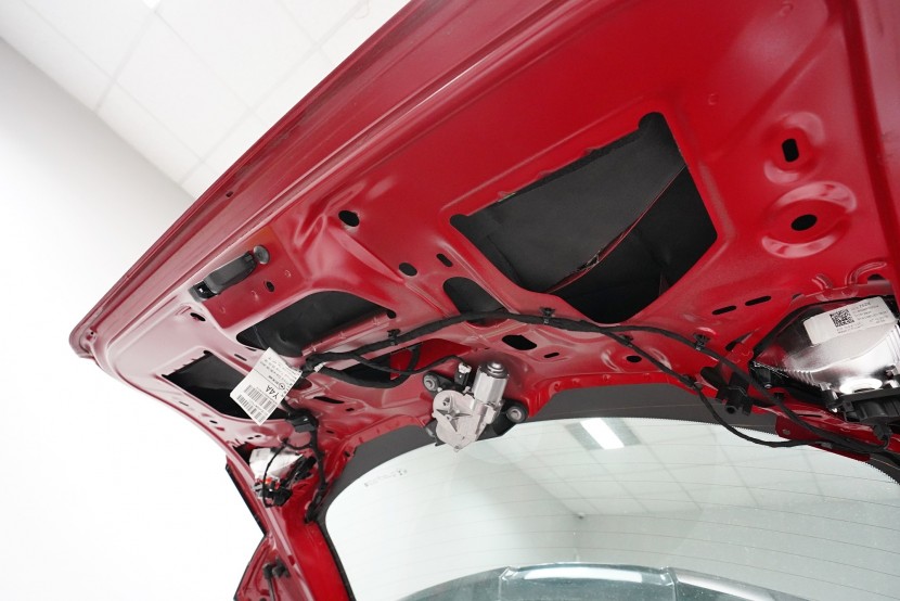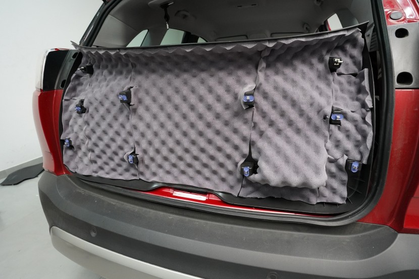 Zavazadlovému prostoru se věnujeme s podobnou pečlivostí. Na jeho dno aplikujeme lehký antivibrační materiál SGM Air 3 o tloušťce 3 mm a vysokým MLF 0,42 jednotek. Tento prémiový materiál jsme zvolili zejména z toho důvodu, abychom příliš nenavyšovali hmotnost v zadní části vozu. Díky své vysoké účinnosti však s přehledem odfiltruje vibrace dna kufru.