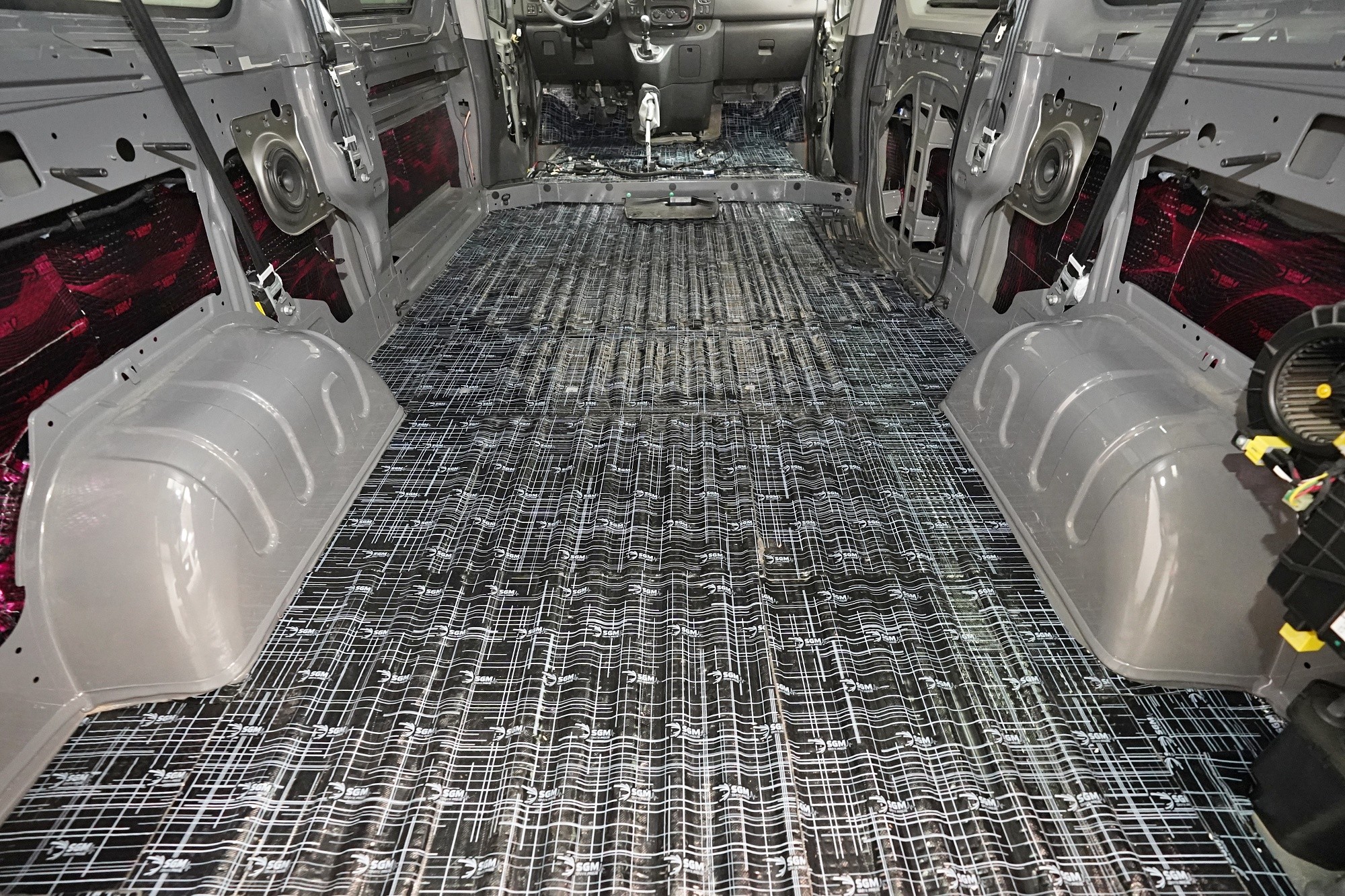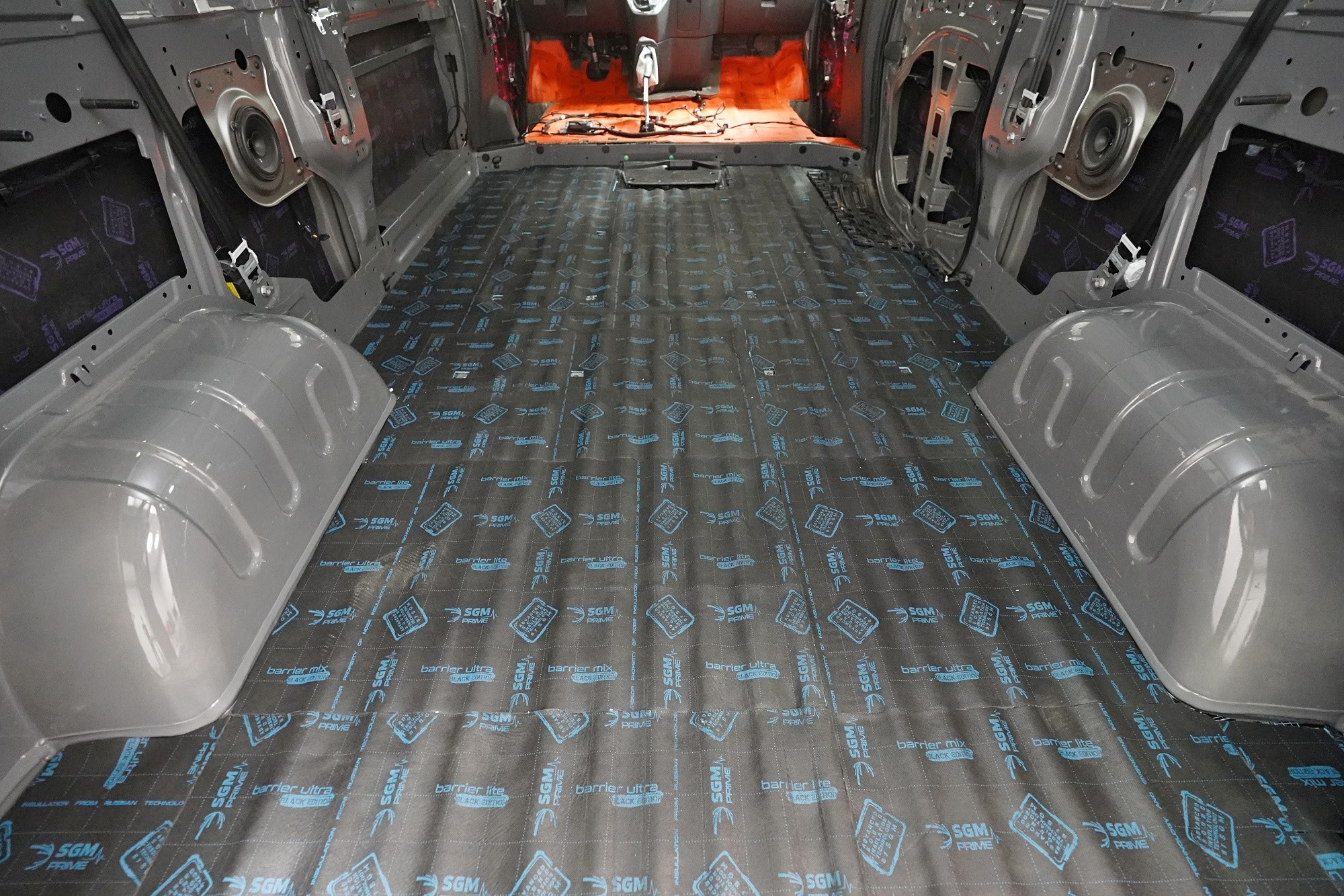 U zadní části podlahy musíme postupovat mírně odlišným způsobem a to zejména kvůli menšímu prostoru a následné snadné instalaci. Konkrétně jsme zvolili v první vrstvě antivibrační materiál SGM Onyx 3 o tloušťce 3 mm a MLF 0,47 jednotek. Materiál je velmi pružný a jednoduše se tvaruje na reliéfní podlaze tohoto vozu.