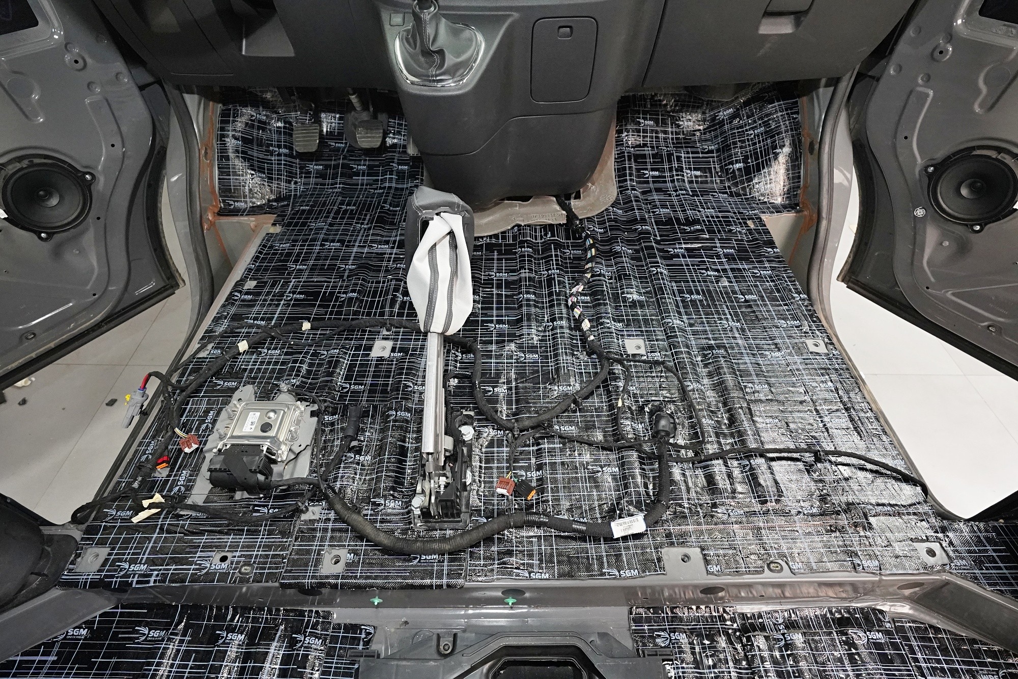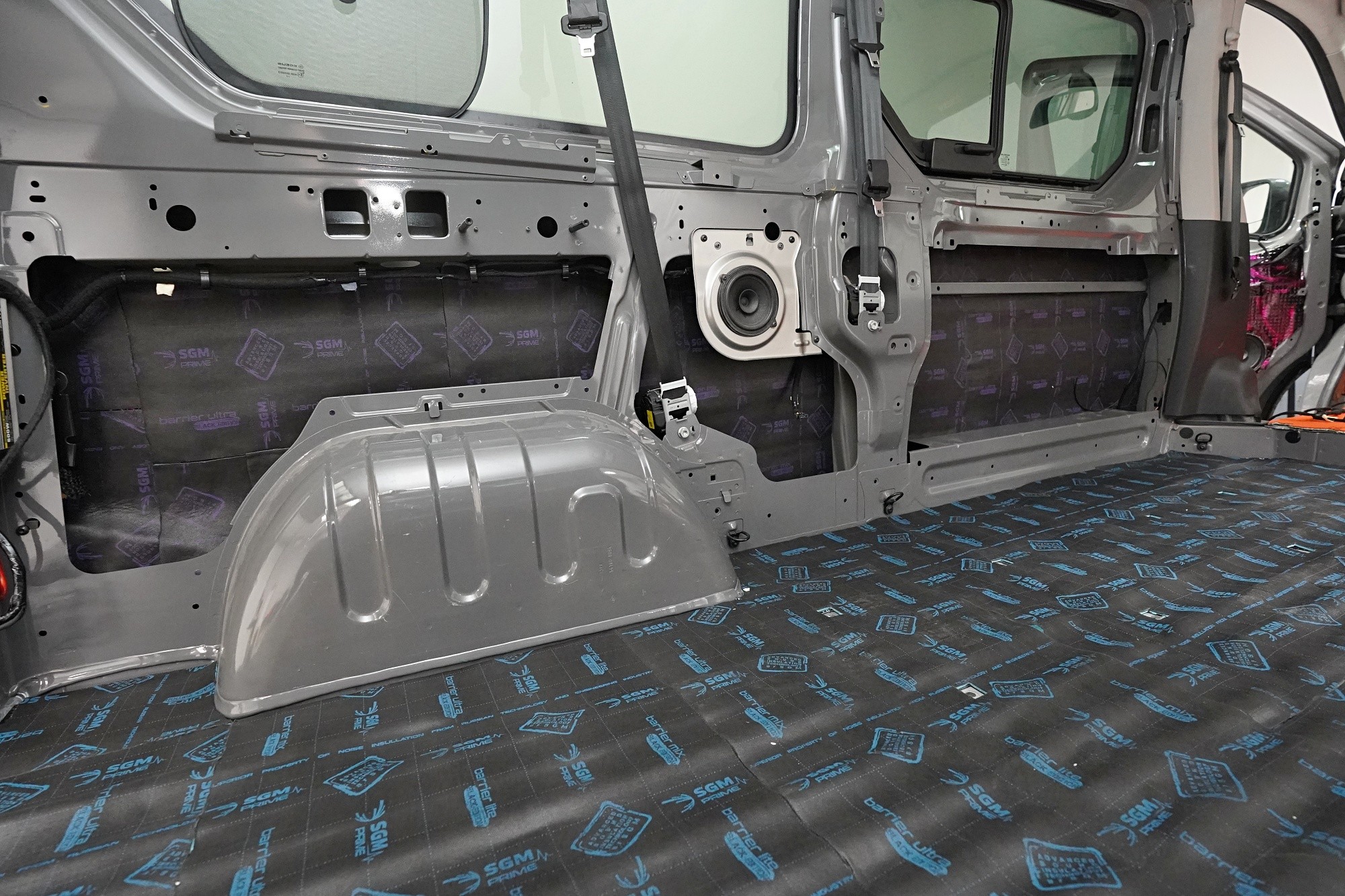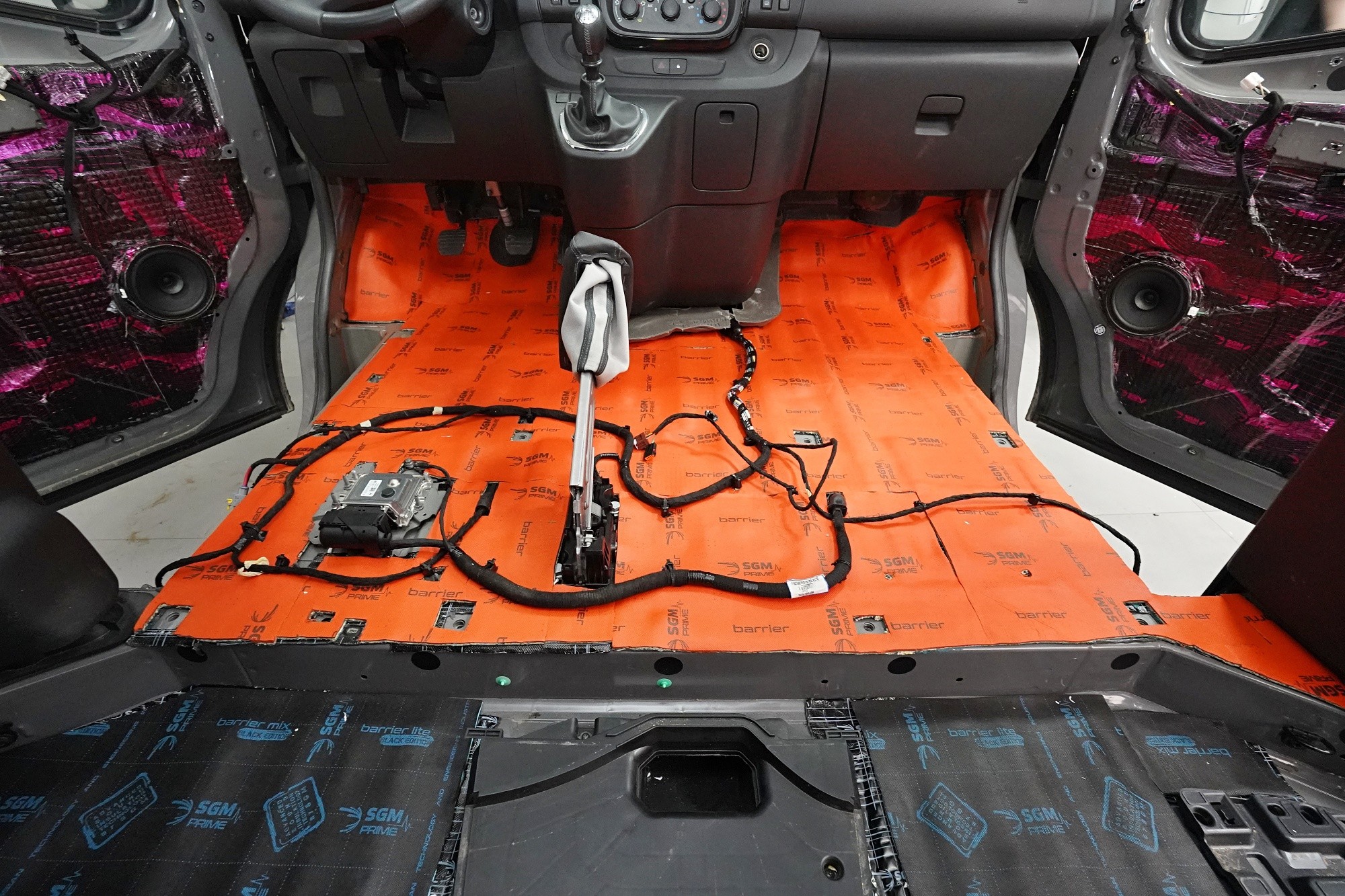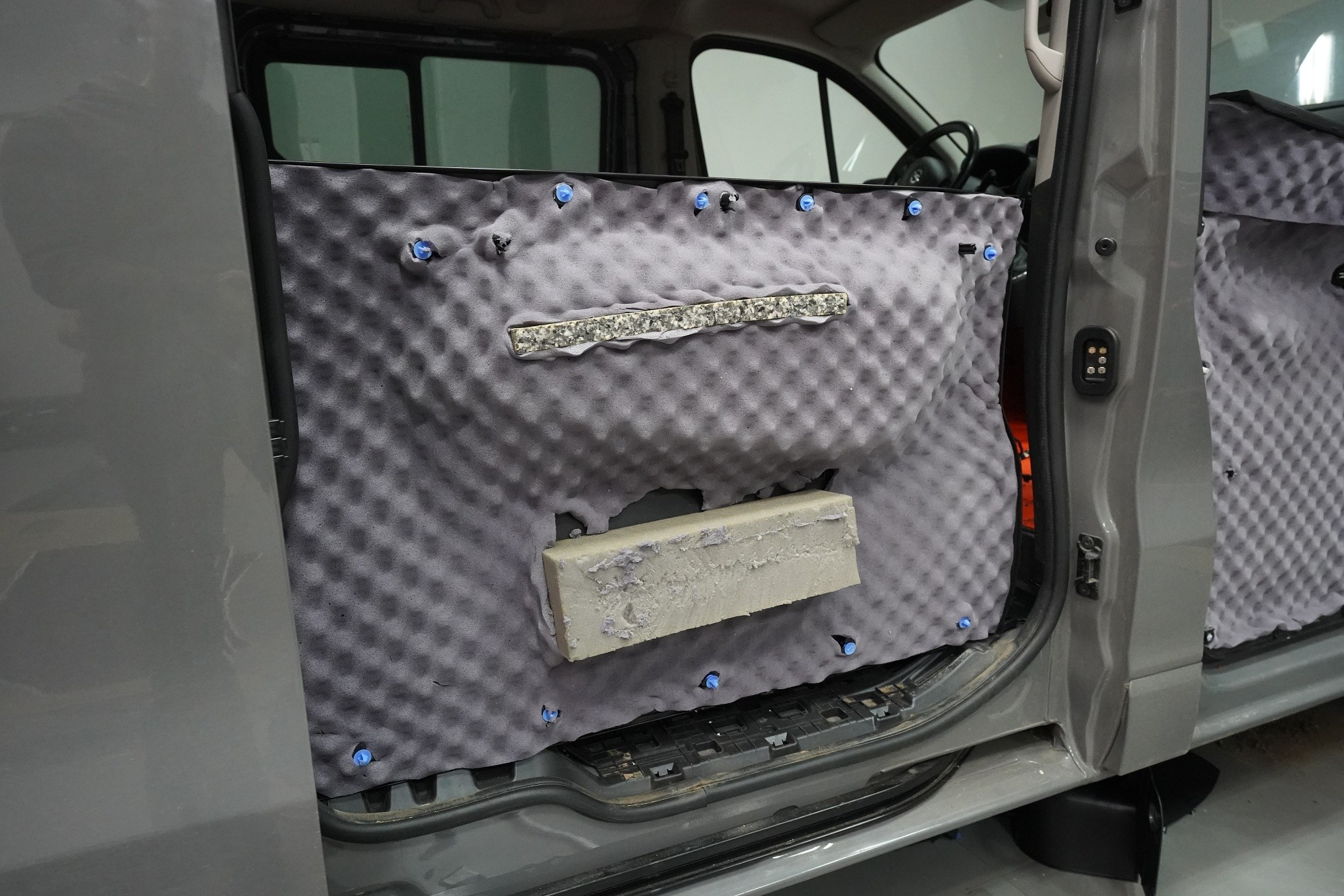 Kompletní odhlučnění vozu Opel Vivaro. U tohoto užitkového vozu platí to samé jako u podobných vozidel této kategorie typu Mercedes-Benz Viano nebo VW T6. Tovární zvuková izolace prakticky neexistuje a také Vivaro trpí na vysoký hluk v interiéru. Uživatelé si nejvíce stěžují na hluk od vozovky, motoru, podběhů předních i zadních kol a díky své konstrukci i na výrazný i aerodynamický hluk. Pro nejlepší výsledek jsme zvolili kompletní odhlučnění všech oblastí vozu a aplikovali jsme výhradně materiály SGM z nejvyšší modelové řady Prime. Konkrétně jsme se tedy zaměřili na přední, posuvné i páté dveře, podlahu, střechu, boky, přední i zadní podběhy, torpédo a kapotu. Odhlučňujeme samozřejmě i většinu plastových dílů v interiéru, abychom zabránili vrzání a skřípání plastů. Všechny zvolené materiály jsou i tepelně izolační a tento vůz je nově chráněn i před tepelnými ztrátami. Na odhlučnění pracují zároveň čtyři naši technici, kteří montáž zvládnou v rámci 1 pracovního dne.
