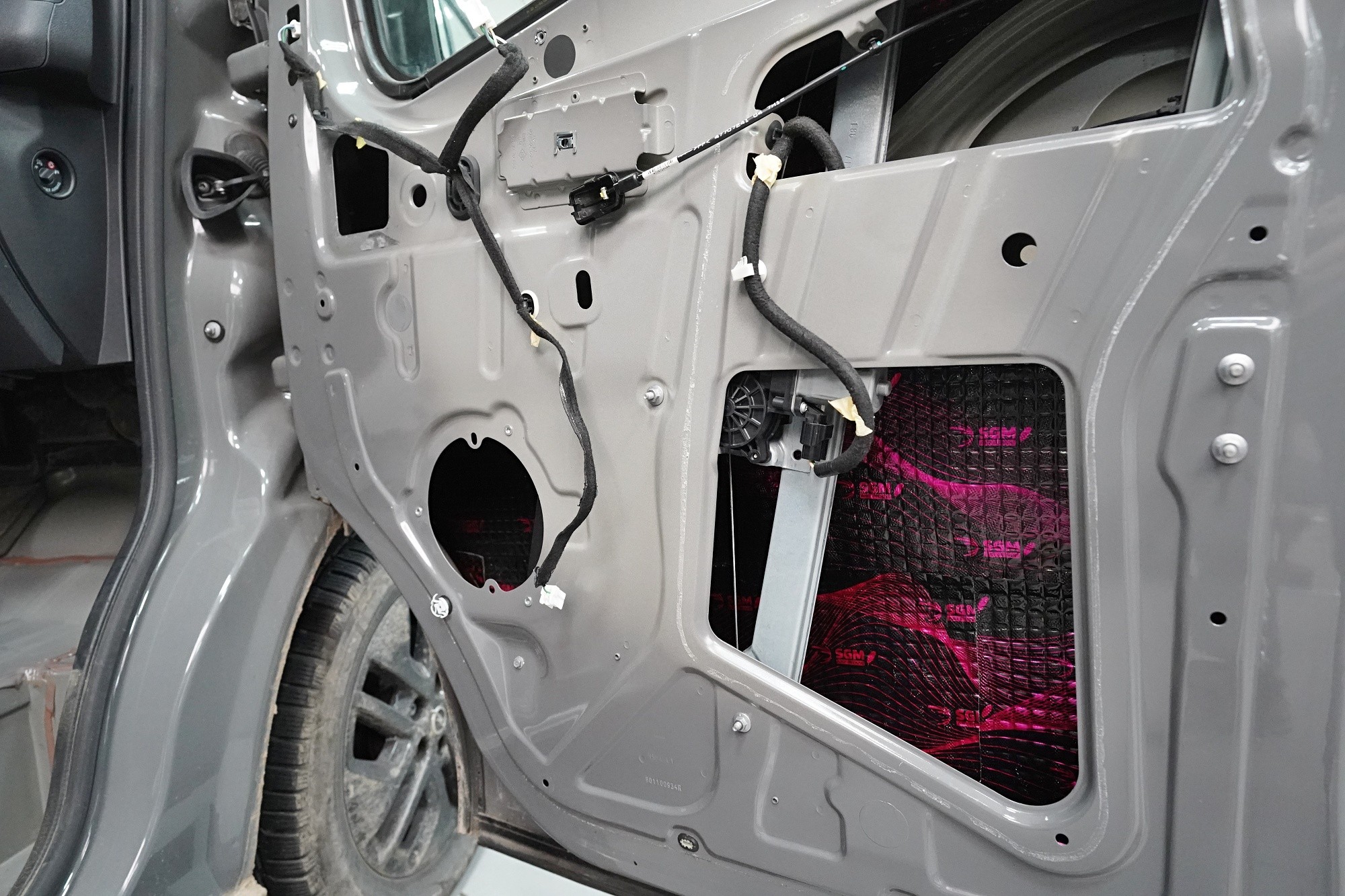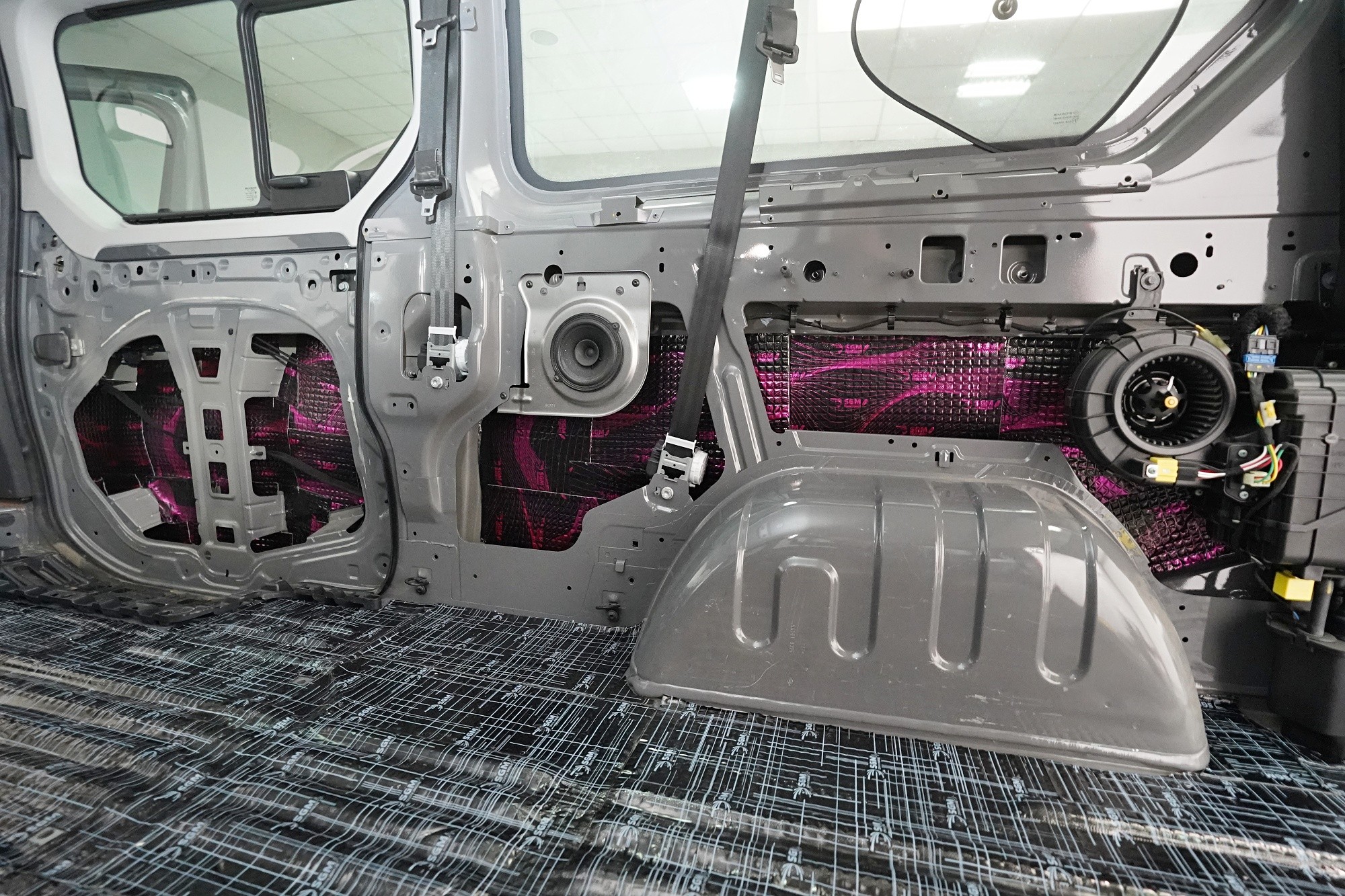 Blatníky a posuvné dveře jsou ve druhé vrstvě opatřeny lehkým membránovým materiálem SGM Barrier Lite momentálně v černo-fialové barvě v limitované Black Edition, který v dalším kroku najdete i ve dveřích. Zadní podběhy v tomto případě odhlučňujeme z vnější strany, protože nejsou kryty žádným čalouněním.