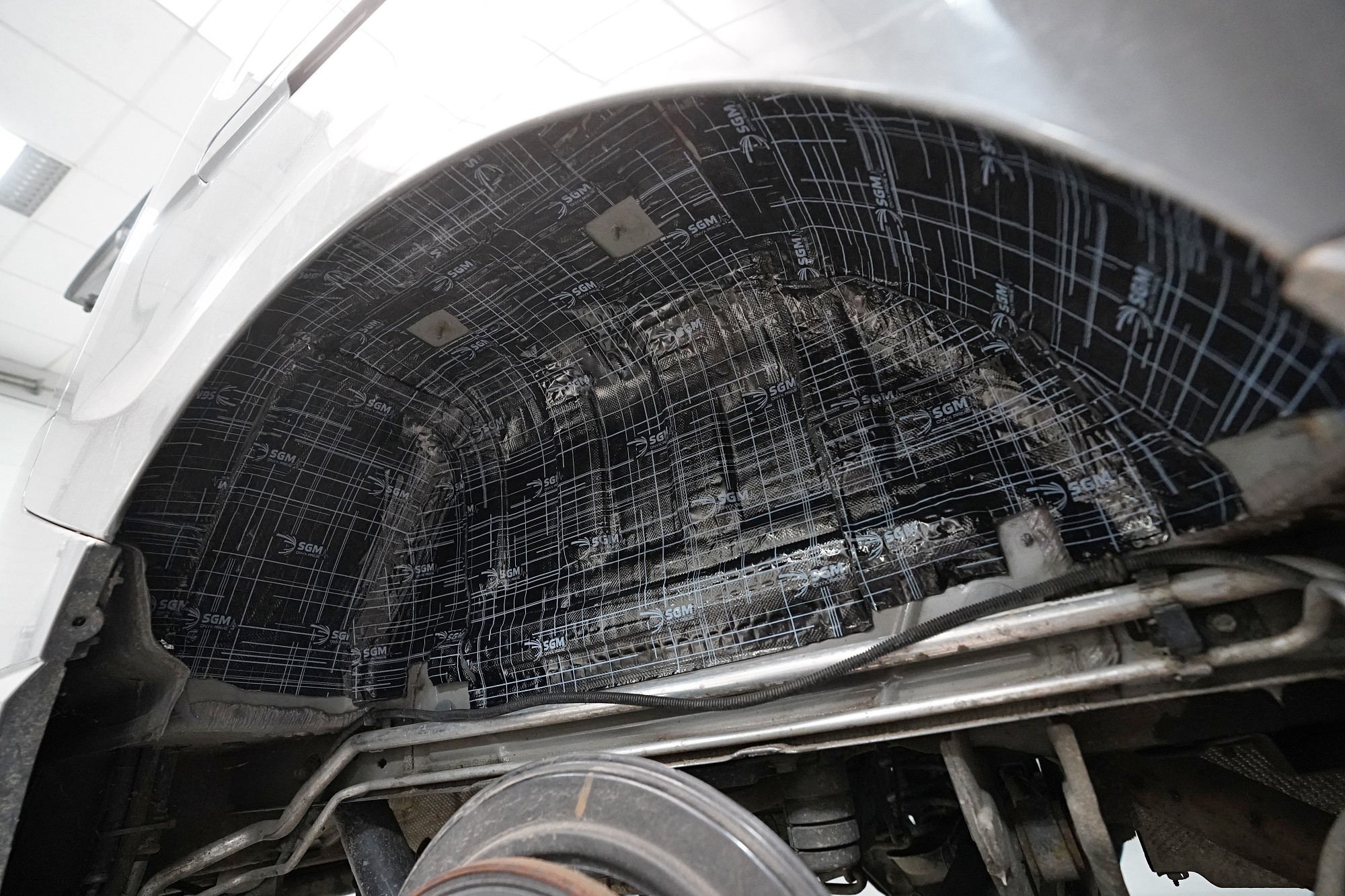 Druhou vrstvu tvoří membránový materiál SGM Barrier Ultra, který již znáte z odhlučnění zadní části podlahy. Barrier Ultra spolu s první vrstvou odhlučnění zamezí hluku od pneumatik, je samozřejmě zcela voděodolný a neodlepí se po celou dobu životnosti vozu.