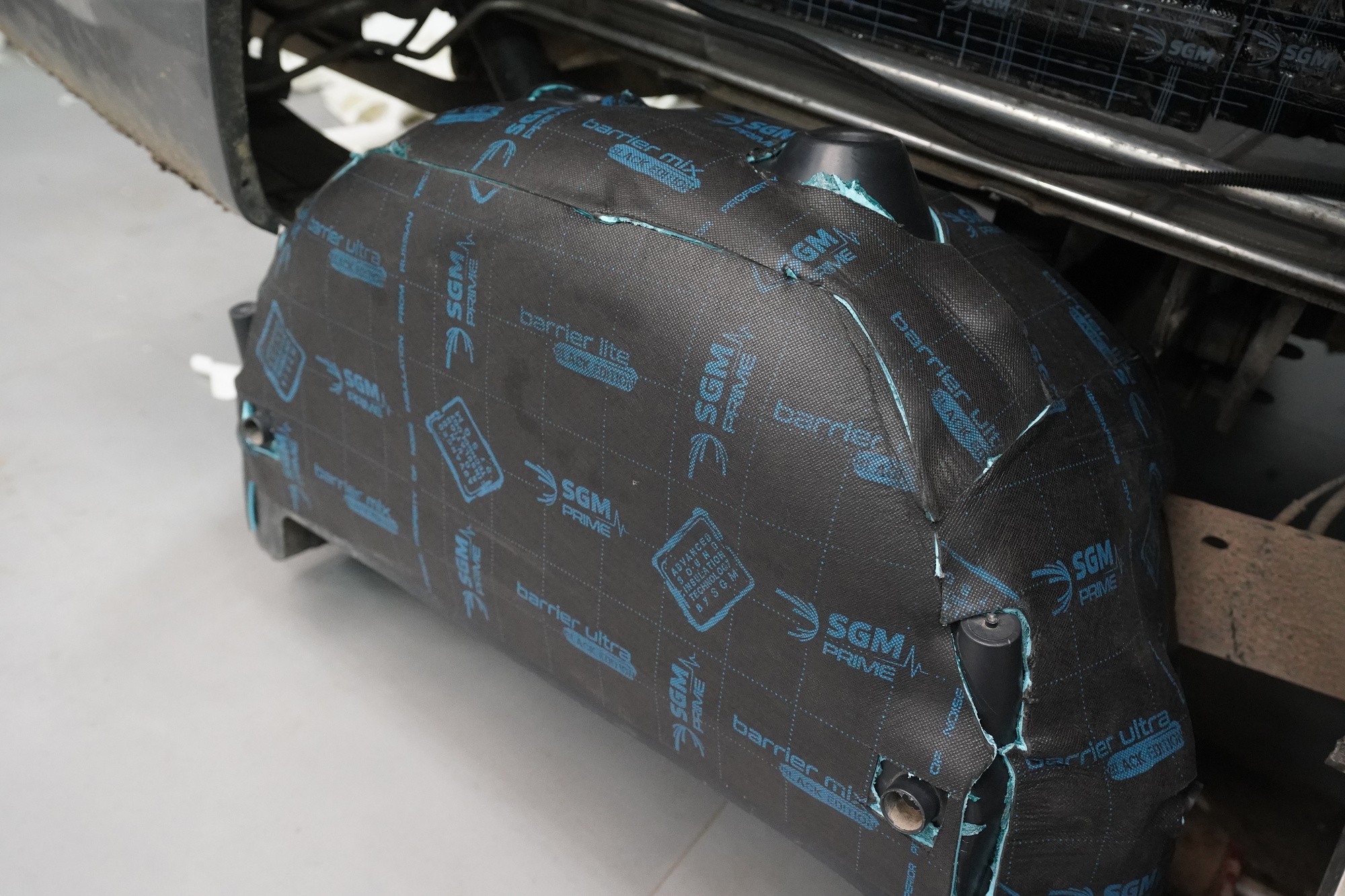 Na blatníky a posuvné dveře aplikujeme odlehčený antivibrační materiál SGM Air 2, který se pyšní nejen velmi nízkou hmotností, ale vysokým ztrátovým činitelem 0,34 jednotek při tloušťce 2 mm. Tyto parametry jsou pro tyto oblasti dostačující a my se pouštíme do druhé vrstvy odhlučnění.