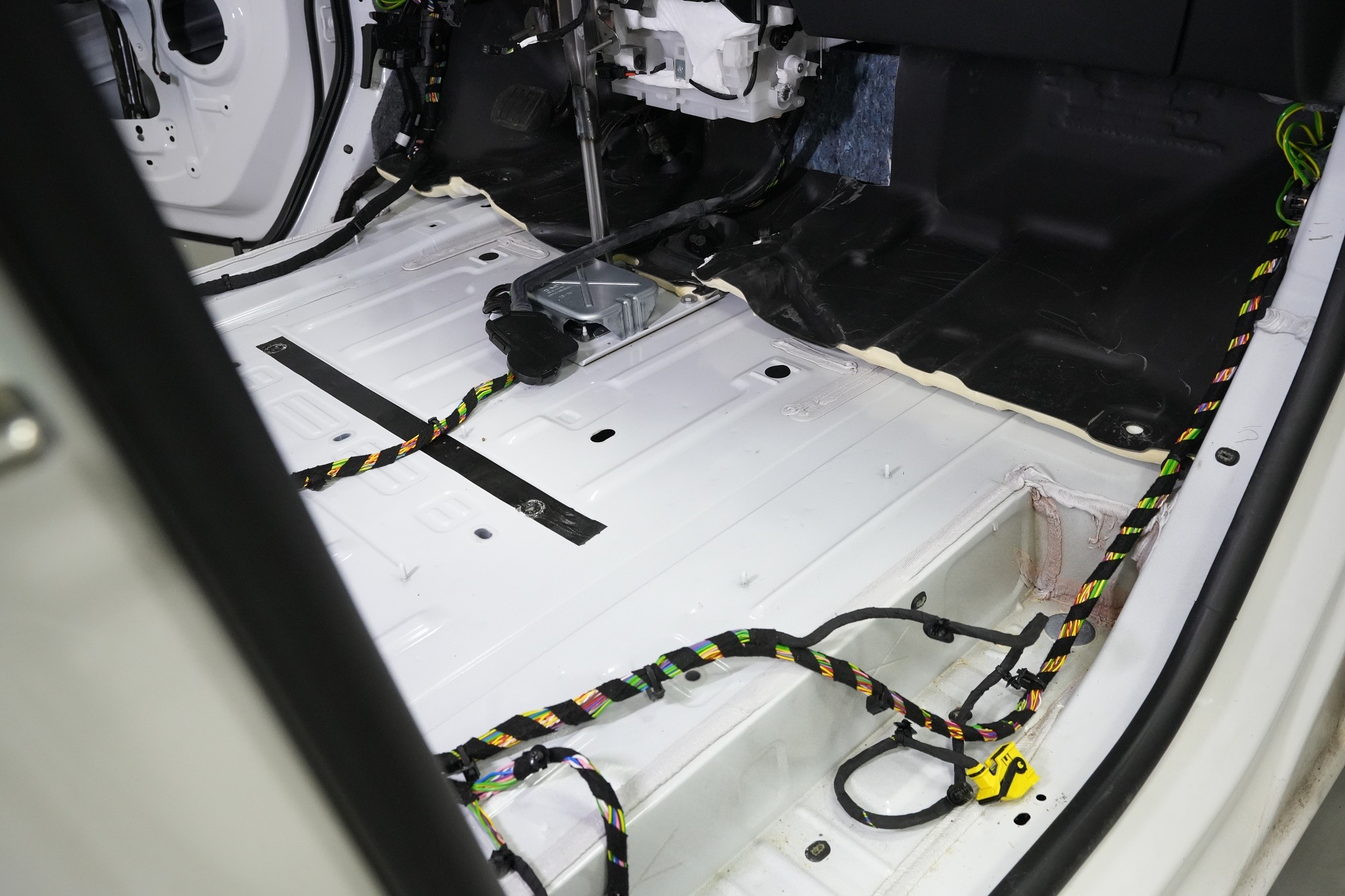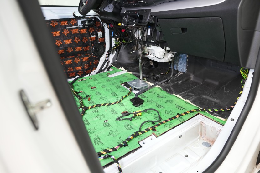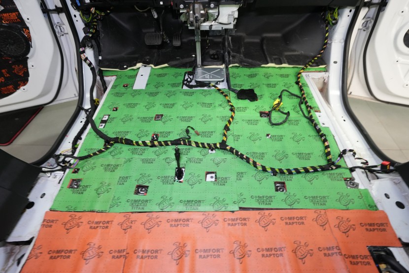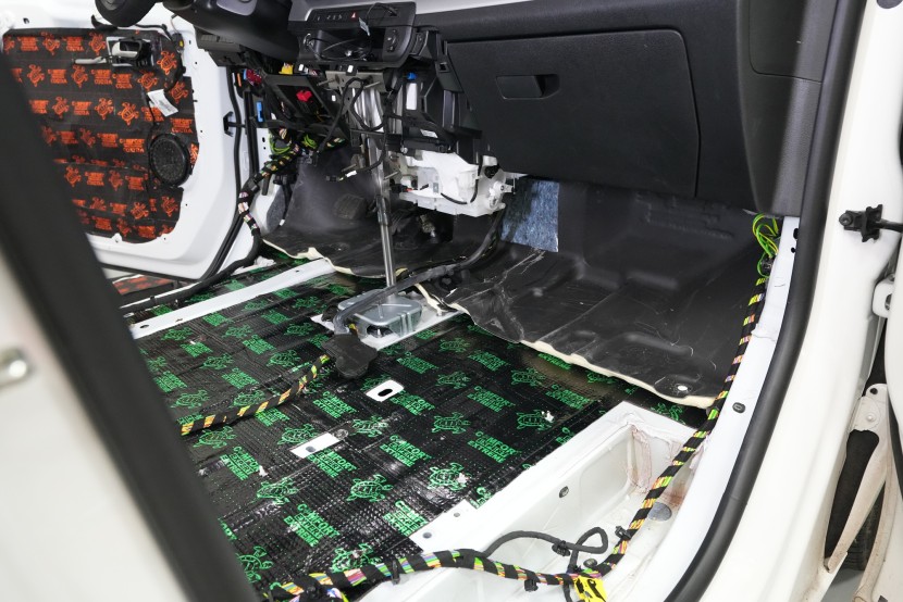 Titan Lite spolu s Extremem aplikujeme na všechny přístupné oblasti, abychom umožnili izolaci maximálního množství vibrací a hluku. V přední části podlahy se dostáváme až pod palubní desku, díky čemuž důkladně odhlučníme i přední podběhy z vnitřní části vozu, kde je přístup k větší ploše karoserie. Podlahu tedy odhlučňujeme vysoce účinným antivibračním materiálem o tloušťce 3,5 mm a zvukově izolačním materiálem v druhé vrstvě o tloušťce 7 mm. Celkem tedy téměř 11 mm zvukové izolace, což má za následek důkladné zamezení hluku od předních pneumatik i bez aplikace z vnější strany.