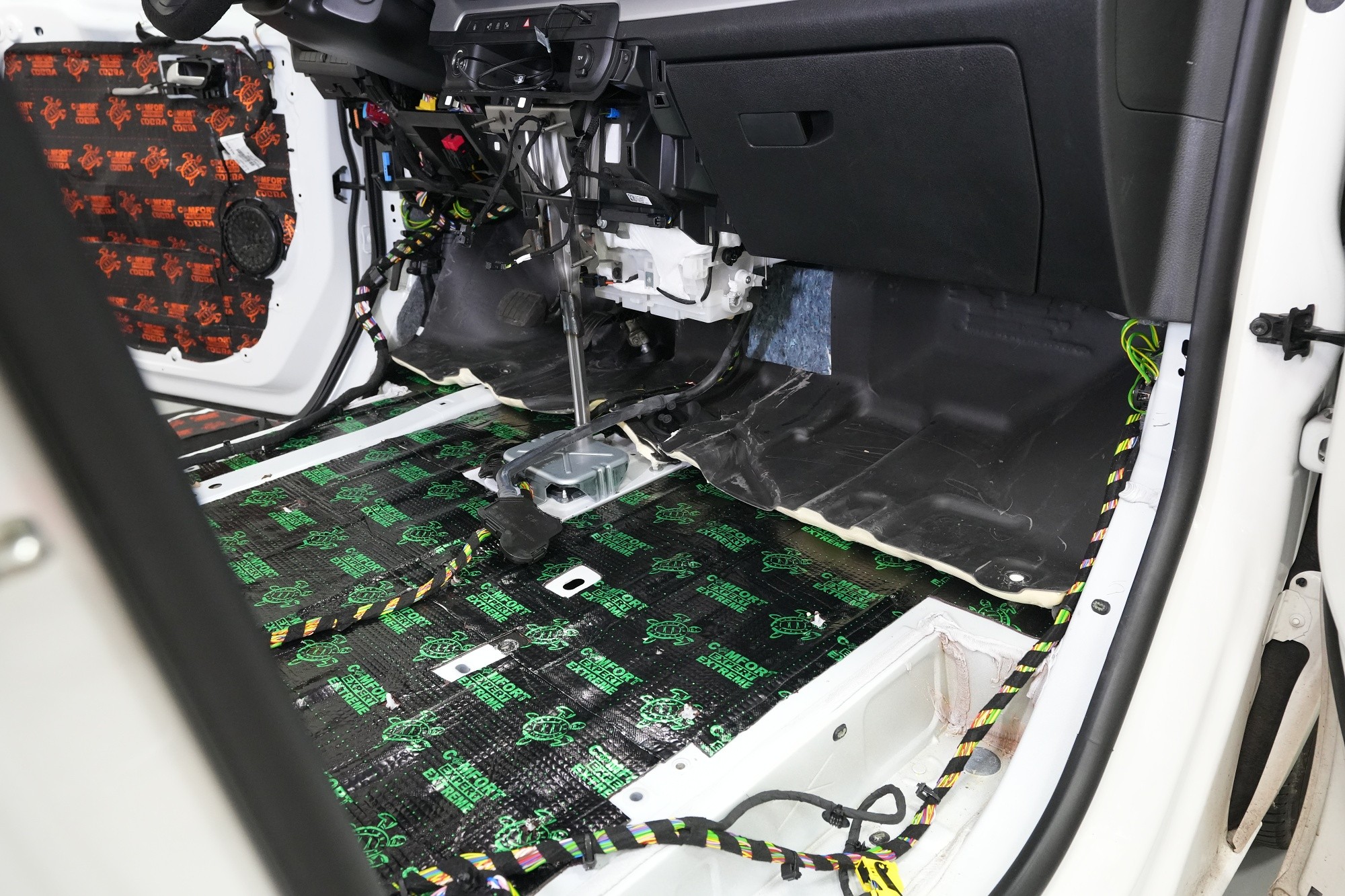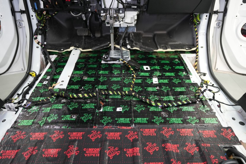 K odhlučnění vozidla nejvíce přispívá důkladné odhlučnění podlahy, která je kvůli výrazným vibracím a hluku zejména o nízkých frekvencích nejvíce náročná na použití správných materiálů. I proto u balíčku Expert Plus používáme profesionální antivibrační materiál Comfortmat Extreme, který při své tloušťce pouhých 3,5 mm poskytuje akustický ztrátový činitel (MLF) 0,63 jednotek. To z něj dělá nejúčinnější antivibrační materiál na trhu o tloušťce do 4 mm a perfektně se tedy hodí do našich instalací zaměřených na maximální účinnost.