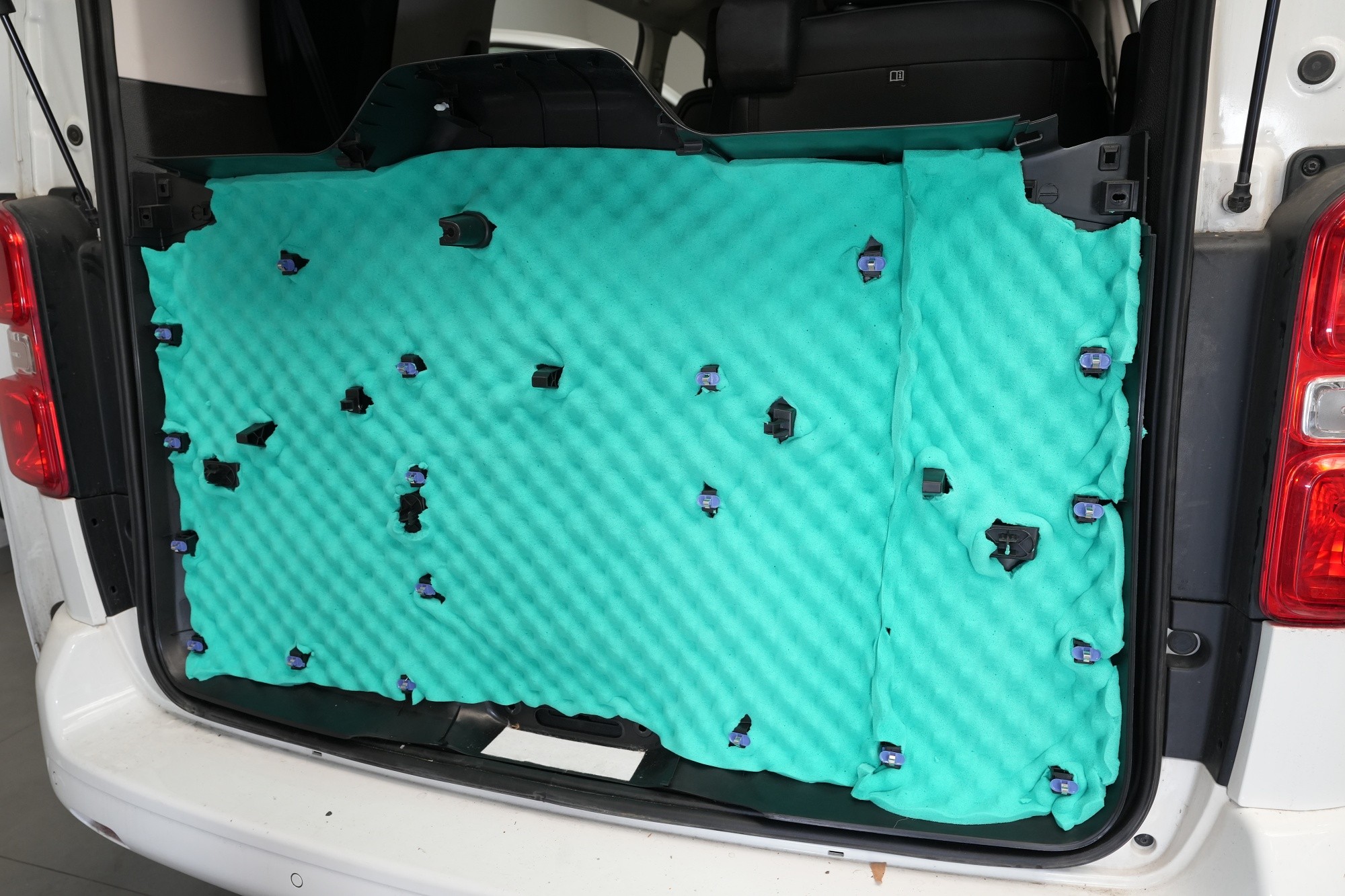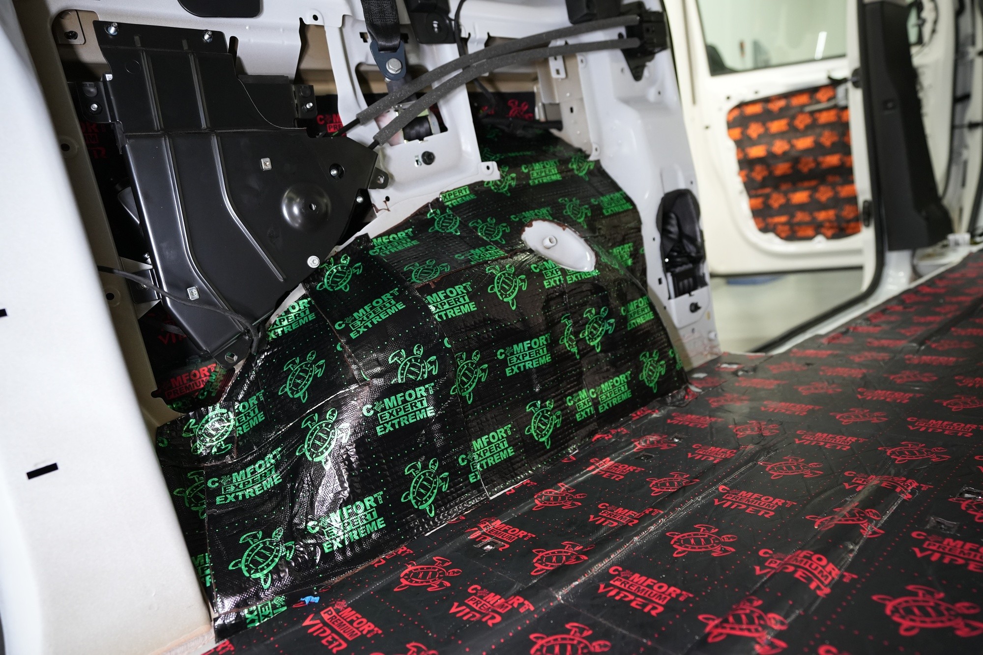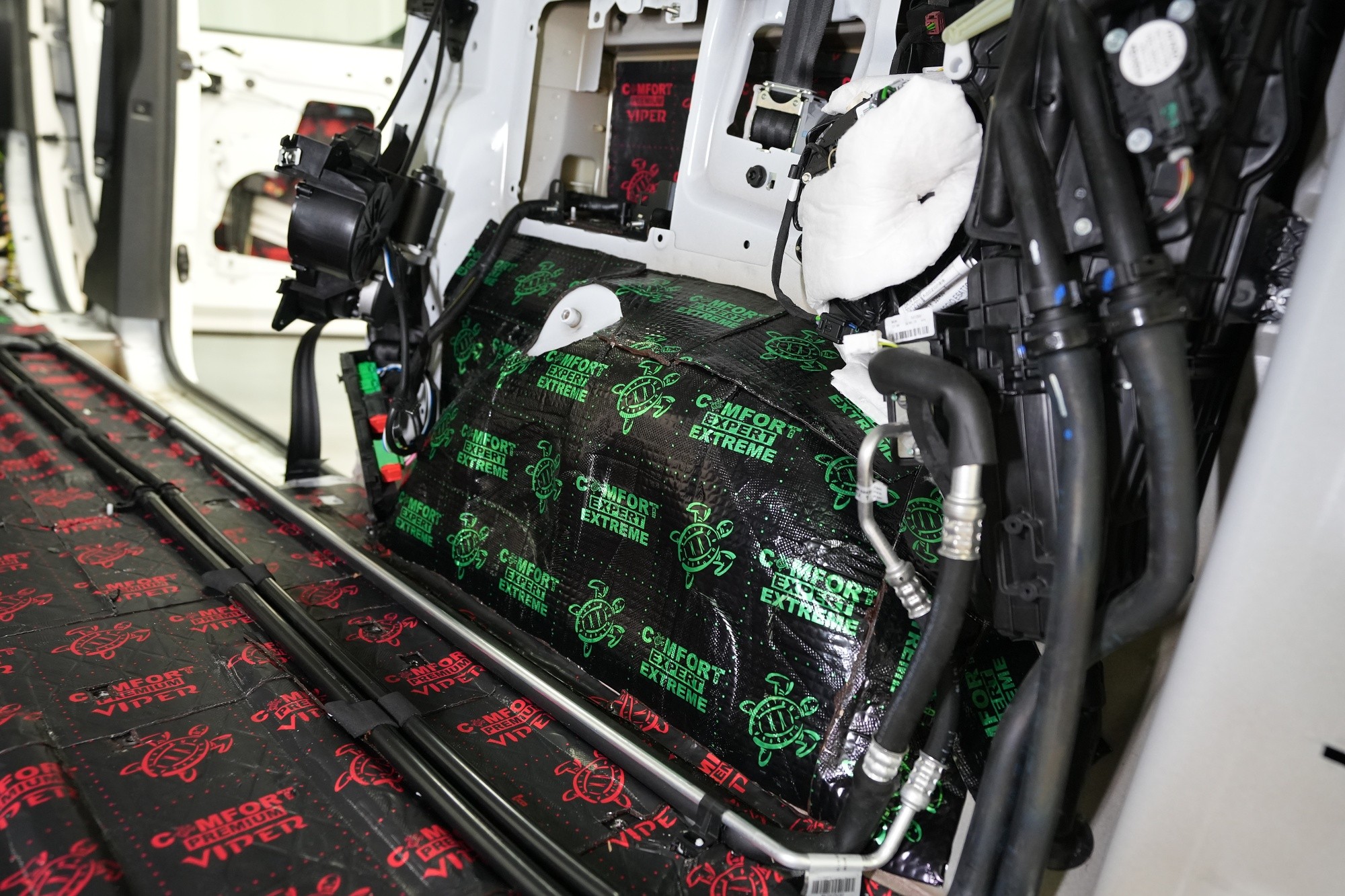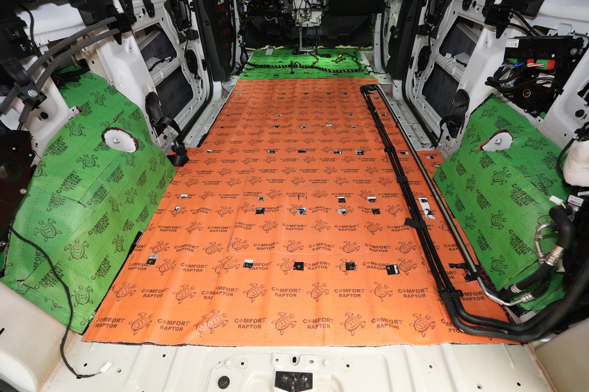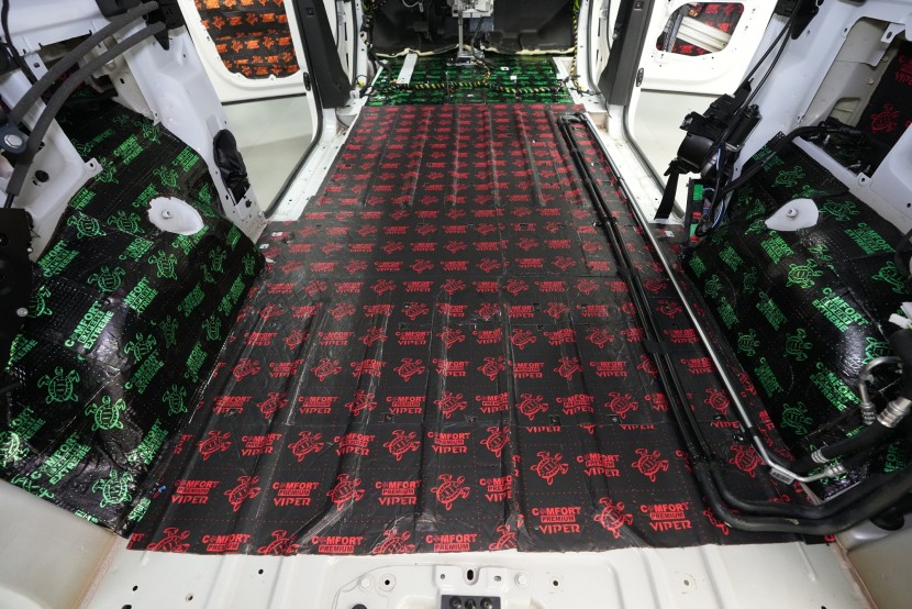 Zadní podběhy, které jsou nejvíce zatížené vibracemi i hlukem, opatříme stejně jako přední část podlahy antivibračním materiálem Comfortmat Extreme. Na boky vozu a posuvné dveře aplikujeme u balíčku Expert Plus v první vrstvě antivibrační materiál Comfortmat Viper. Jedná se tedy o stejně účinný materiál jako v případě zadní části podlahy.