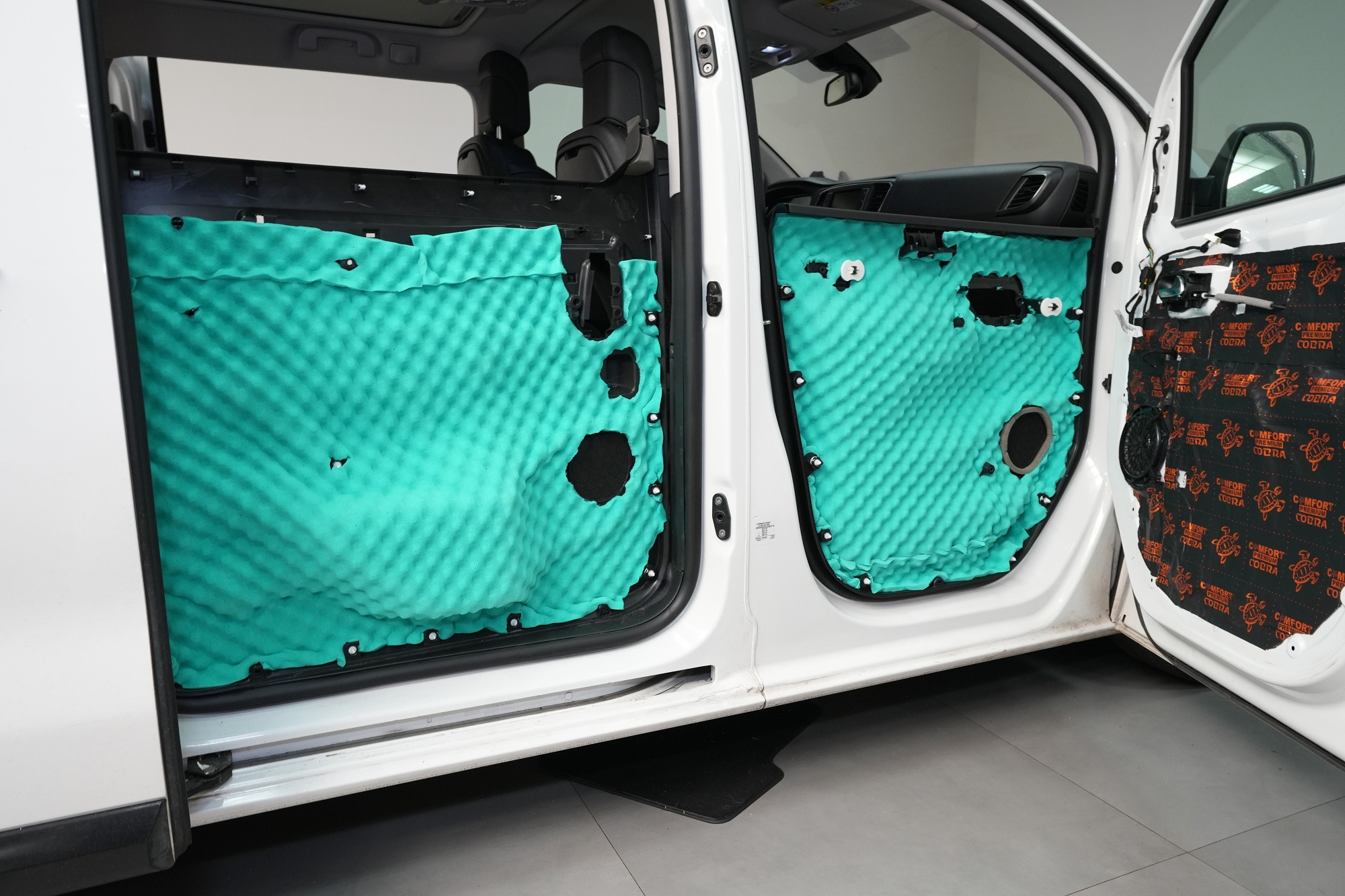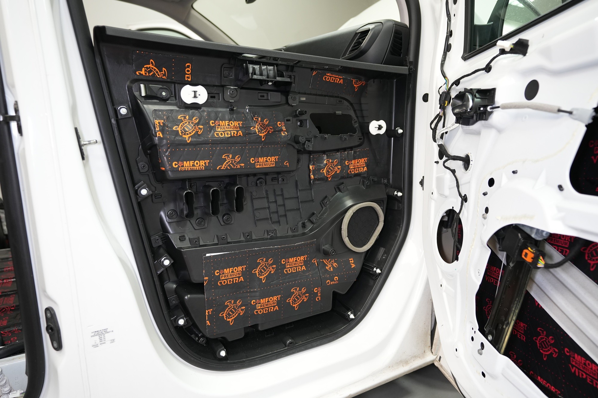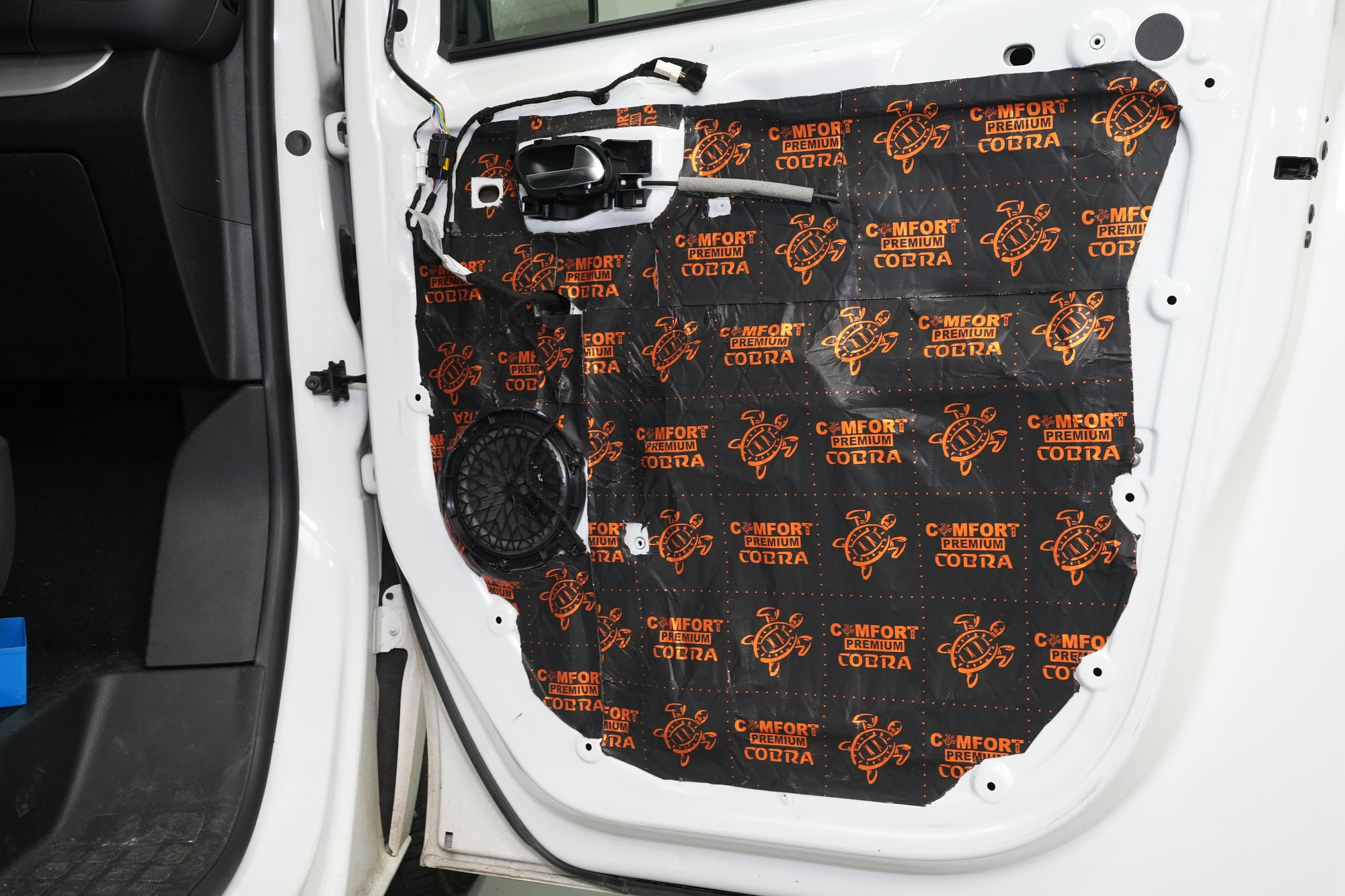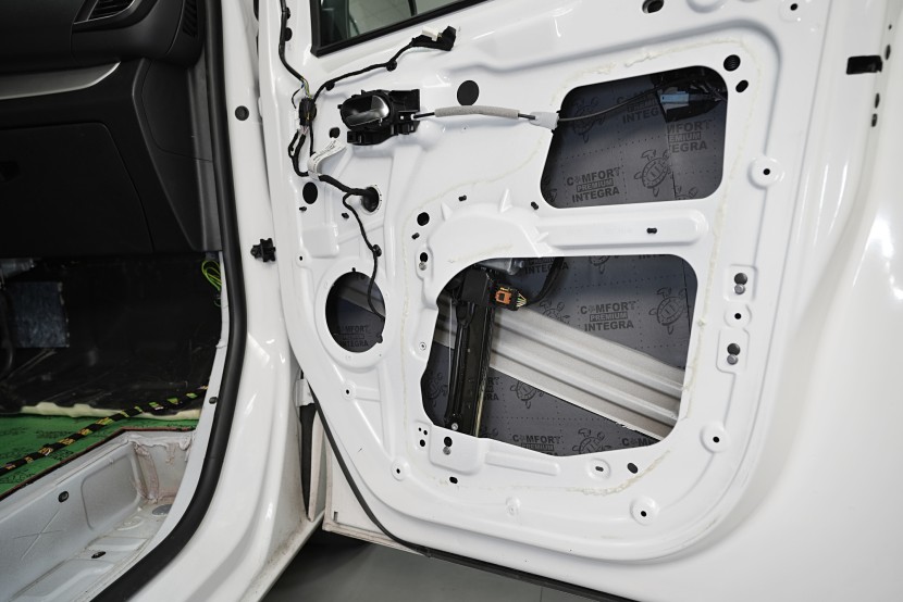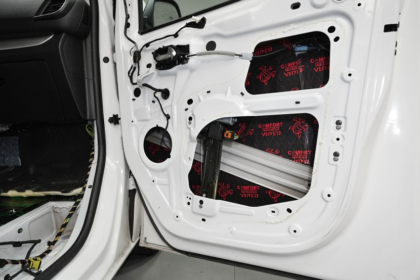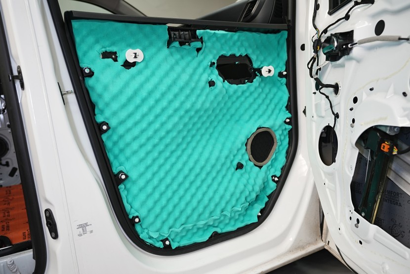 Následně aplikujeme antivibrační materiál Comfortmat Cobra, který se pyšní nejnižší hmotností ze všech antivibračních materiálů na trhu v dané tloušťce 2,3 mm. Tato vrstva slouží k zamezení vibrací a rezonancí vnitřního plechu dveří a u většiny vozidel i k vytvoření uzavřené ozvučnice pro reproduktory, což má za následek zlepšení ozvučení. Zejména basová složka středobasového reproduktoru dozná podstatného zlepšení, což oceníte nejen u továrních reproduktorů.