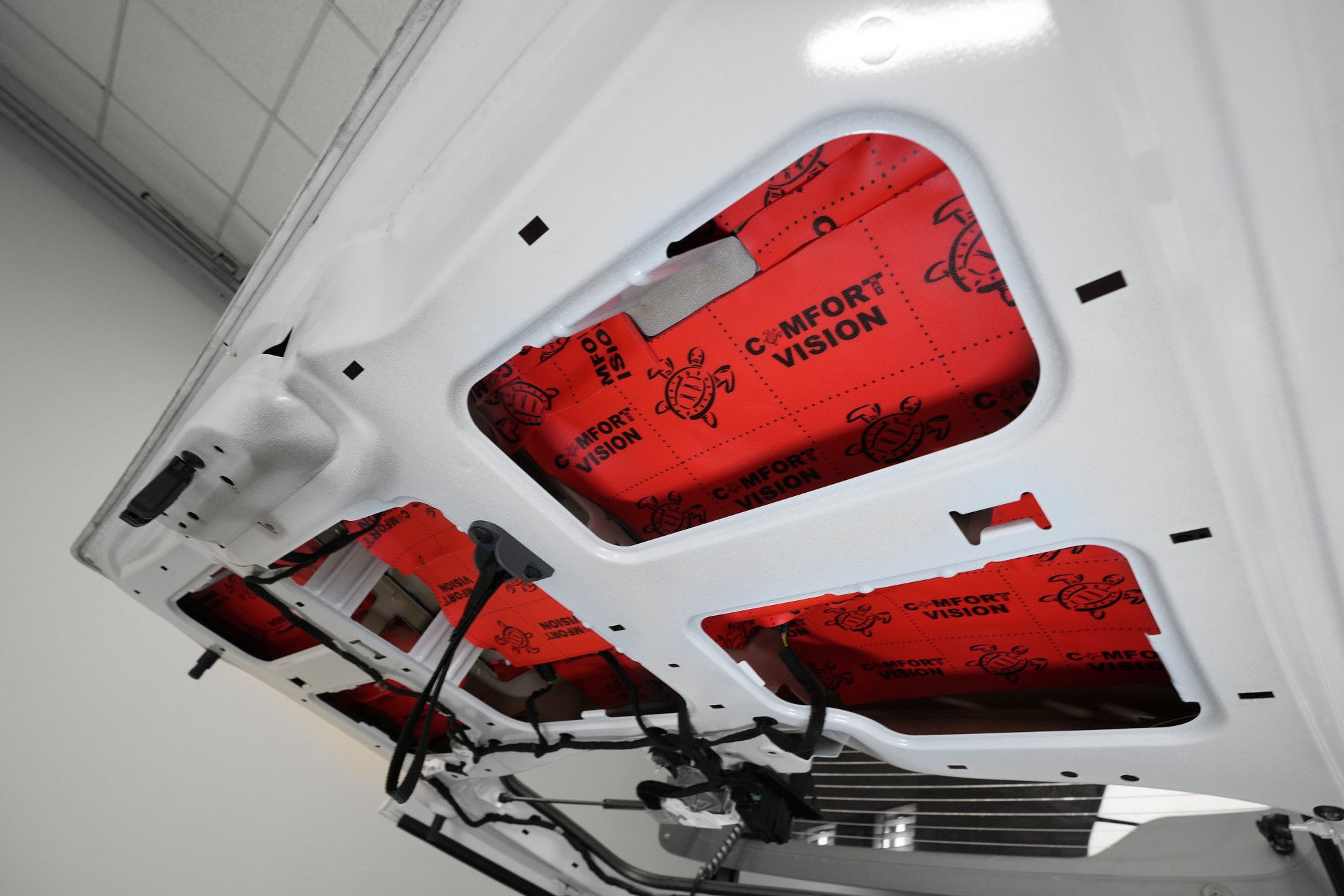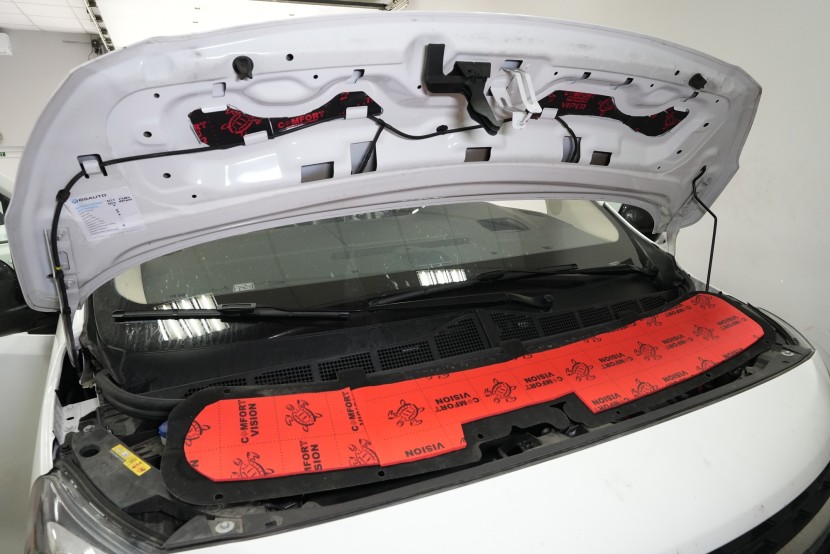 Nezapomínáme ani na kapotu, na kterou v první vrstvě aplikujeme opět lehký antivibrační materiál Comfortmat Cobra. Tím kapotu zpevníme, zamezíme vibracím, které se přenáší do dalších částí vozu a zmizí i typický plechový zvuk při zavření kapoty. Na originální kryt kapoty následně aplikujeme zvukově i tepelně izolační materiál Comfortmat Vision, který sníží hluk motoru a to při zachování původního vzhledu motorového prostoru.