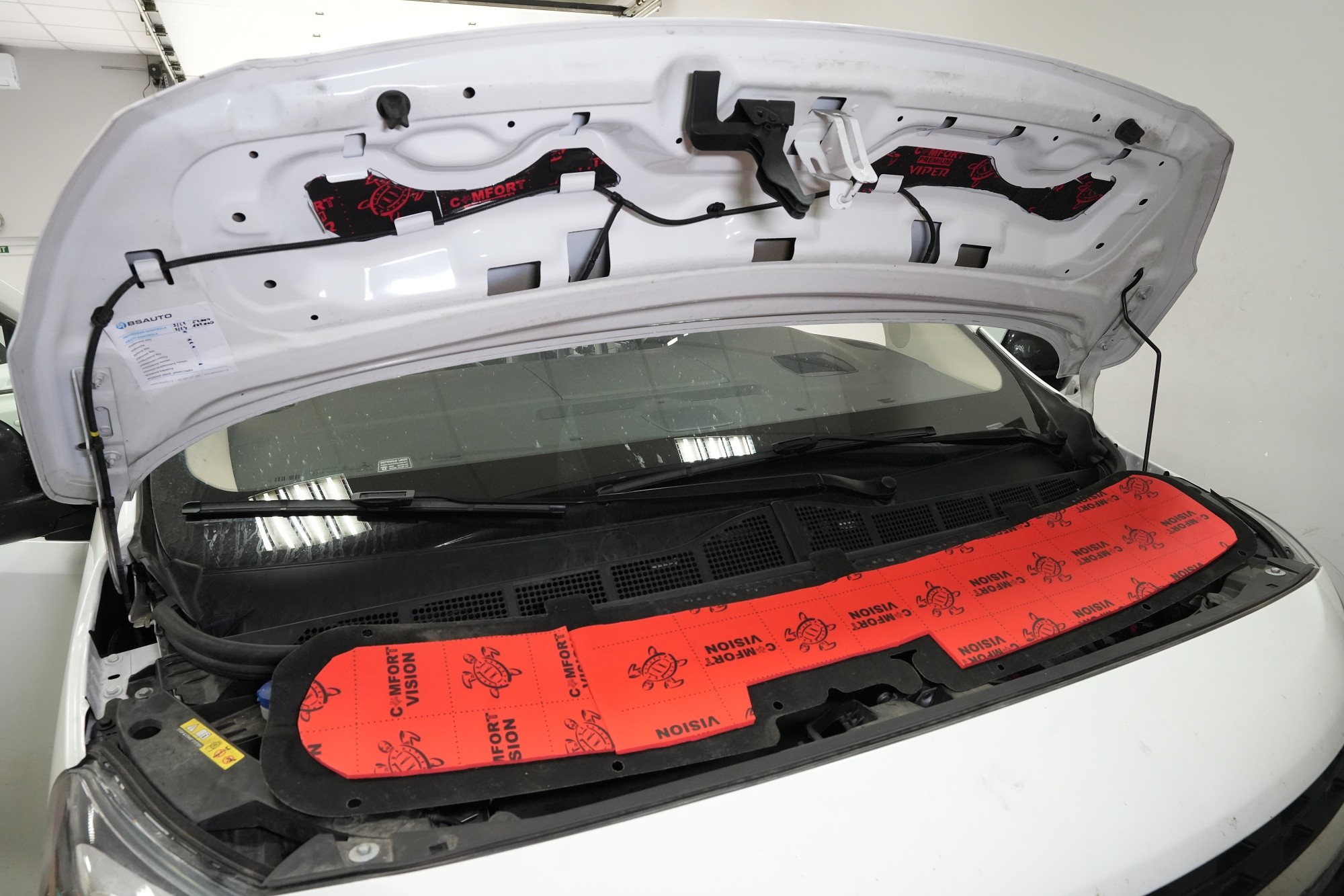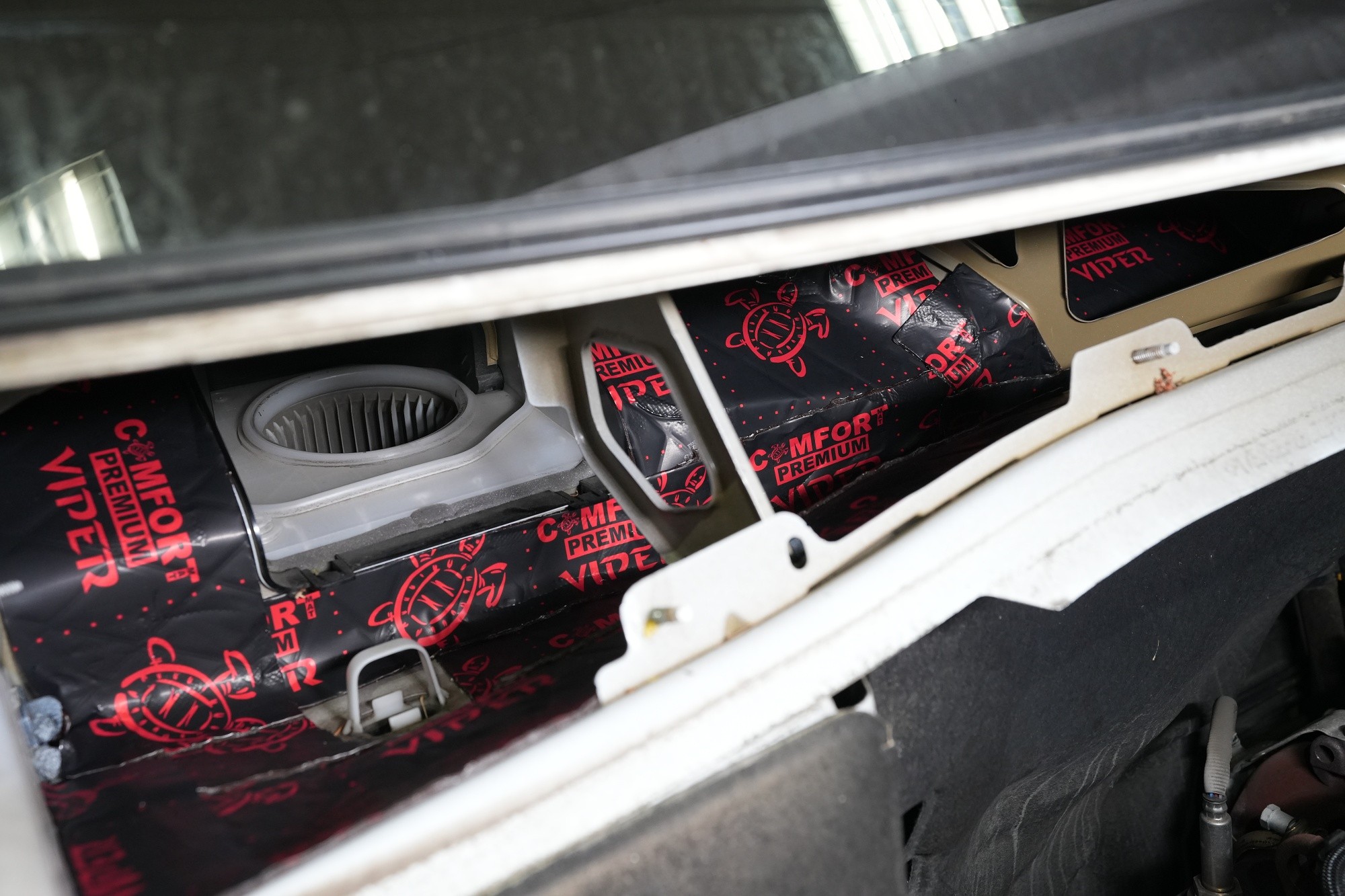 Také odhlučnění torpéda může přinést zajímavé výsledky. Stěrače jsou zdrojem silných vzduchových turbulencí a prostor pod spodním okrajem čelního skla je často veliký. Vytváří se zde efekt zvuku v jeskyni a to v bezprostřední blízkosti interiéru. Druhým důvodem k odhlučnění torpéda je snížení hluku od motoru. Nejprve tradičně aplikujeme antivibrační materiál, konkrétně Comfortmat Viper, který odfiltruje silné vibrace motoru.