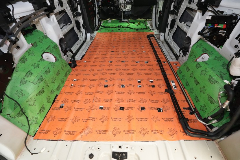 Na zadní část podlahy aplikujeme oranžový membránový materiál Comfortmat Raptor, který je díky své tloušťce 4 mm ideálním materiálem pro tuto oblast. Nenechte se však zmást tenkou tloušťkou, Raptor obsahuje stejně jako Blockshot 2 mm silnou protihlukovou membránu a díky tomu dosahuje účinnosti až 30 dB. A díky tomu náleží Raptoru titul nejúčinnějšího zvukově izolačního materiálu na trhu o této tloušťce.