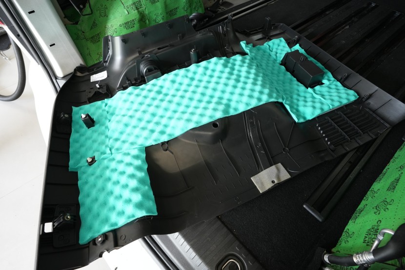 U zadní části podlahy musíme postupovat mírně odlišným způsobem a to zejména kvůli menšímu prostoru a následné snadné instalaci interiérového obložení. Konkrétně jsme zvolili v první vrstvě antivibrační materiál Comfortmat Viper o tloušťce 3 mm a MLF 0,49 jednotek. Materiál je lehký, velmi pružný, nemusí se nahřívat a jednoduše se tvaruje na reliéfní podlaze tohoto vozu.