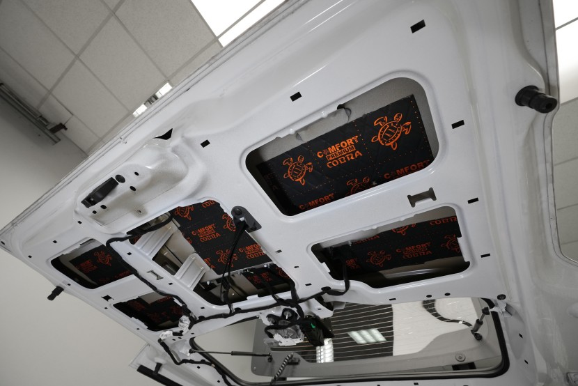 Na zadní podběhy aplikujeme stejně jako na přední část podlahy membránový materiál Comfortmat Titan Lite o tloušťce 7 mm a účinnosti 36 dB. Titan Lite důkladně odfiltruje agresivní hluk od pneumatik a zamezí i hluku od zavěšení kol nebo vody. Na boky vozu a posuvné dveře aplikujeme odlehčený membránový materiál Comfortmat Integra, který používáme i pro odhlučnění dveří.