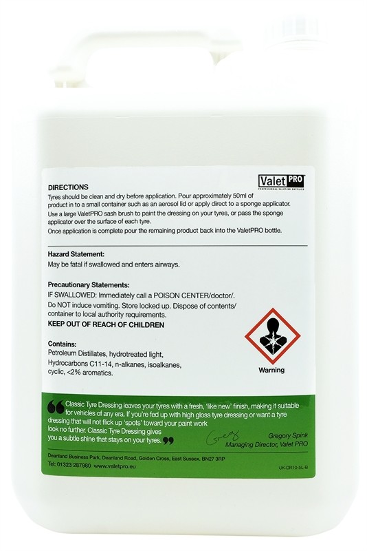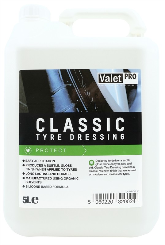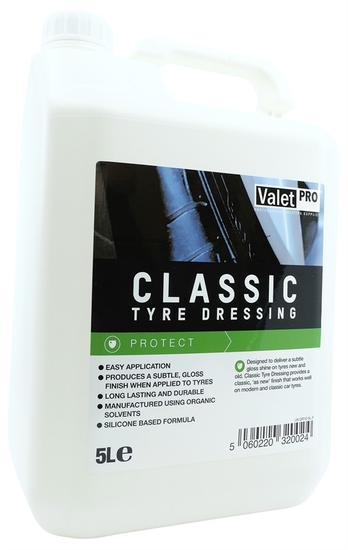 Classic Tyre Dressing je silikonový ošetřující přípravek na pneumatiky. Ve ValetPRO použili směs silikonových rozpouštědel s nízkým množstvím těkavých organických sloučenin (VOC a vytvořili tak ošetřující přípravek na pneumatiky, který zanechává dokonalou ochrannou vrstvu na pneumatikách. Dodává čistý lesk, který vydrží. Obsahuje speciální silikony, které dodávají vysokou odolnost. Přípravek je vytvořený tak, aby se ochranná vrstva držela na pneumatikách a ne na lakovaném povrchu.