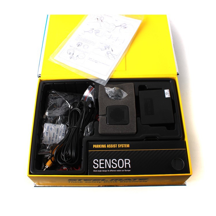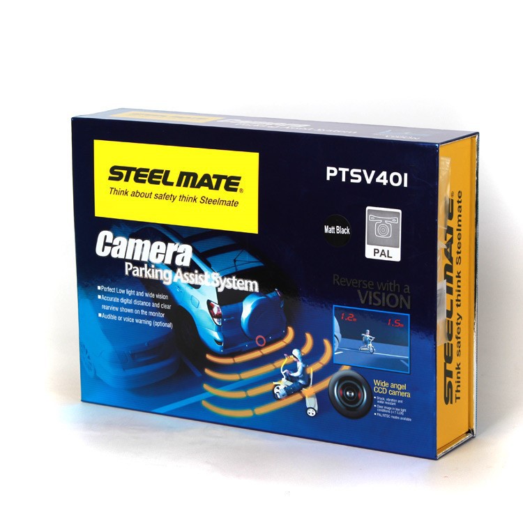 Parkovací asistent Steelmate s kamerou, se 4 senzory a AV vstupem na monitor nebo rádio, určený pro instalaci do zadního nárazníku vozidla. Systém je doplněn o automatickou identifikaci poškozeného senzoru, obsahuje bzučák s nastavitelnou hlasitostí. Sada obsahuje kameru, 4 ks parkovacích senzorů s náklonovými kroužky, řídící jednotku, bzučák a kabeláž. Napájecí napětí 12V.