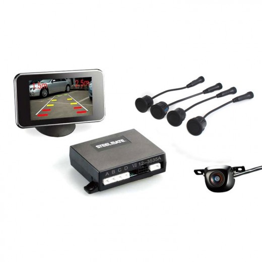 Parkovací asistent Steelmate se 4 snímači, parkovací kamerou a 3.5" TFT displejem. Barevná kamera pro povrchovou montáž s úhlem pohledu 100° - určená pro instalaci do zadní části vozidla. Monitor zobrazuje obraz z kamery společně s vodícími pruhy, vzdálenost od překážky, a směr, ve kterém se překážka nachází. Parkovací asistent upozorňuje na překážku i zvukovou signalizací. Displej umožňuje přizpůsobovat obraz venkovním světelným podmínkám - nastavovat jas a kontrast. Během jízdy se na monitoru zobrazuje čas. Parkovací asistent se automaticky aktivuje zařazením zpátečky na vozidle.