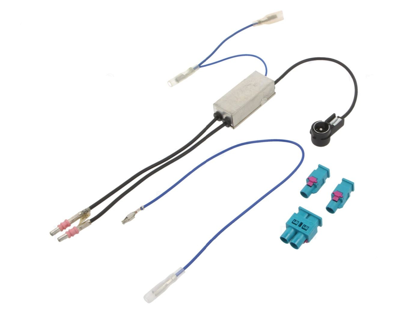 Anténní napáječ a slučovač signálu pro automobily s dvojitou anténou se zesilovačem napájeným po anténním svodu (fantomové napájení). Používá se při instalaci autorádia s jedním anténním vstupem.- Anténní konektor od antény v automobilu dvojitá FAKRA
