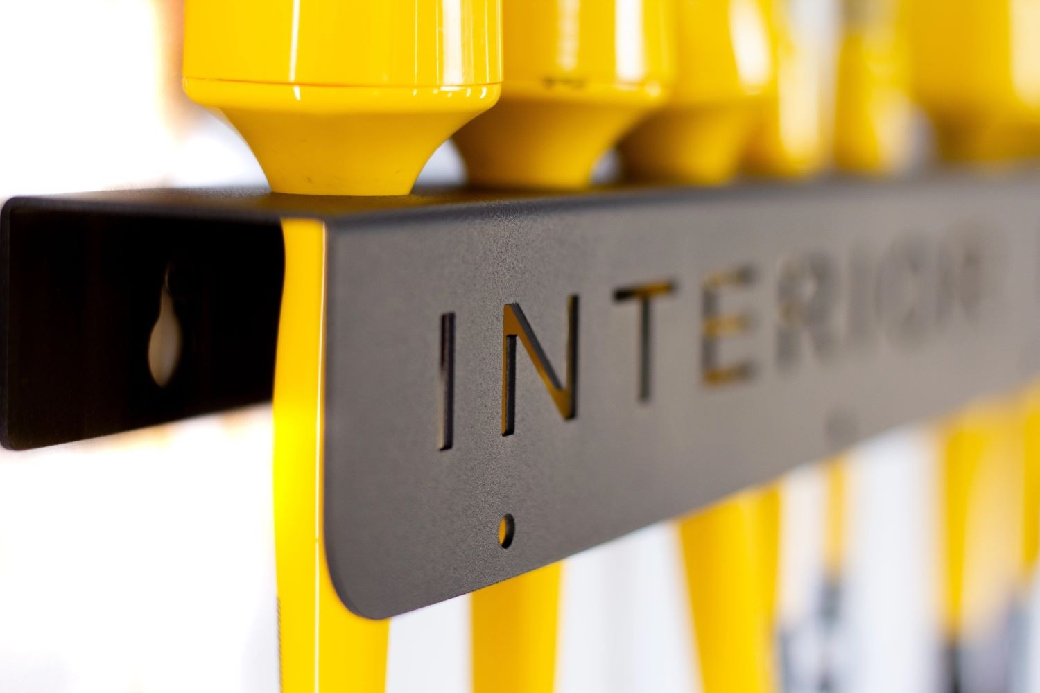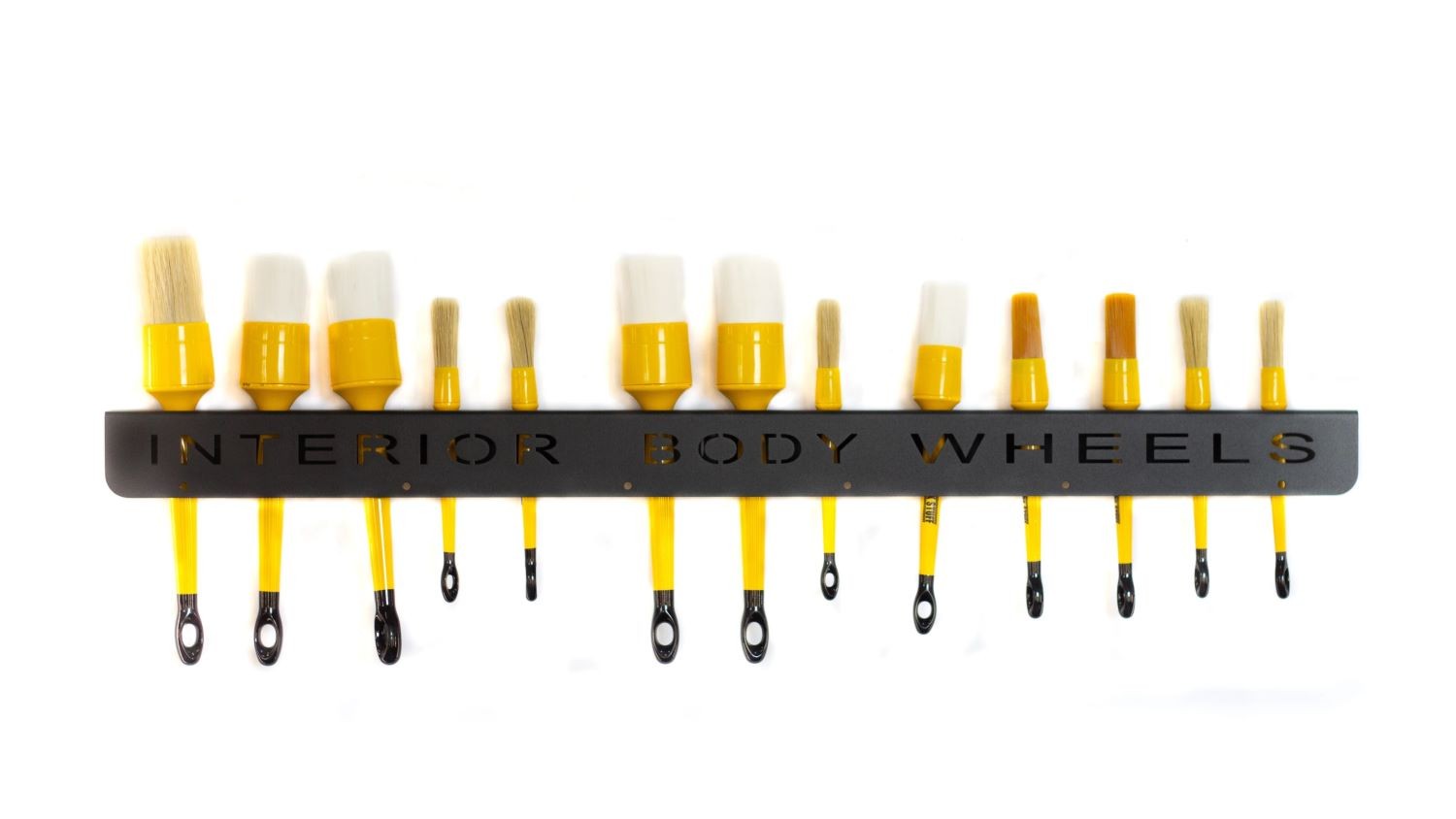 Funkční a pohodlný držák štětců, otvory jsou vhodné pro většinu dostupných štětců či kartáčků. V horní části je 13 míst pro uložení štětců. Montážní otvory pro přišroubování na zeď jsou umístěny v zadní části držáku, díky tomu zaručují naprostou stabilitu. Držák je vyroben z kvalitního kovu, který je upraven práškovou barvou, která chrání proti další oxidaci. Z čelní strany je vyřezaný nápisy INTERIOR, BODY, WHEELS pro rozdělení sekcí dle účelu použití.