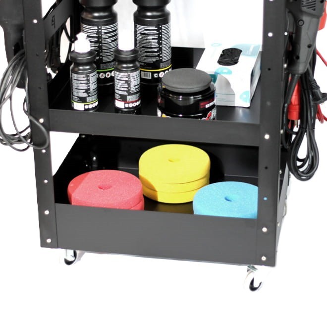 Profesionální verze vozíku rozšířená o střední polici. Vozík je určený nejen do detailingového profesionálního studia, ale i do garáže každého, kdo se rád stará o svůj vůz. Zaměřte se na pohodlí a funkčnost! Velmi praktické řešení vyrobené z těch nejkvalitnějších materiálů, které výrazně zvýší pohodlí při detailingu auta. Správná výška, inovativní řešení a záruka stability jsou jen některé z jeho výhod. Je vyroben z vysoce kvalitní, přesně řezané a ohnuté oceli, která je nakonec ošetřena práškovou povrchovou úpravou pro co největší odolnost proti oxidaci.