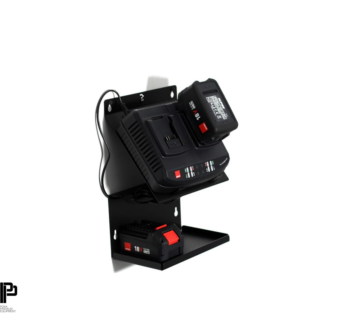 Poka Premium držák na nabíječku a baterie je profesionální, vysoce odolný držák navržený speciálně pro nabíječky a akumulátory bezdrátových strojů. Nabízí nejen elegantní a přehledné uložení, ale i bezpečné používání nabíječky přímo na držáku. Vyroben z 1,5 mm silného konstrukčního plechu nejvyšší kvality. Je opatřen silnou vrstvou zinku pro ochranu proti rzi a korozi, a následně oboustranně lakován odolnou práškovou barvou s jemnou strukturou, která chrání povrch proti poškrábání, vyblednutí a mechanickému opotřebení. Držák je vybaven praktickým prostorem pro kabel a místem pro dvě baterie, které je navíc chráněno nízkou stěnou proti pádu. Díky promyšlené konstrukci a více montážním otvorům je zajištěna vysoká stabilita a bezpečné uchycení nabíječky. Precizní CNC zpracování zaručuje, že držák nemá žádné ostré hrany a je naprosto bezpečný při každodenním používání. Je vhodný pro většinu jednoduchých a duálních nabíječek a baterií dostupných na trhu.