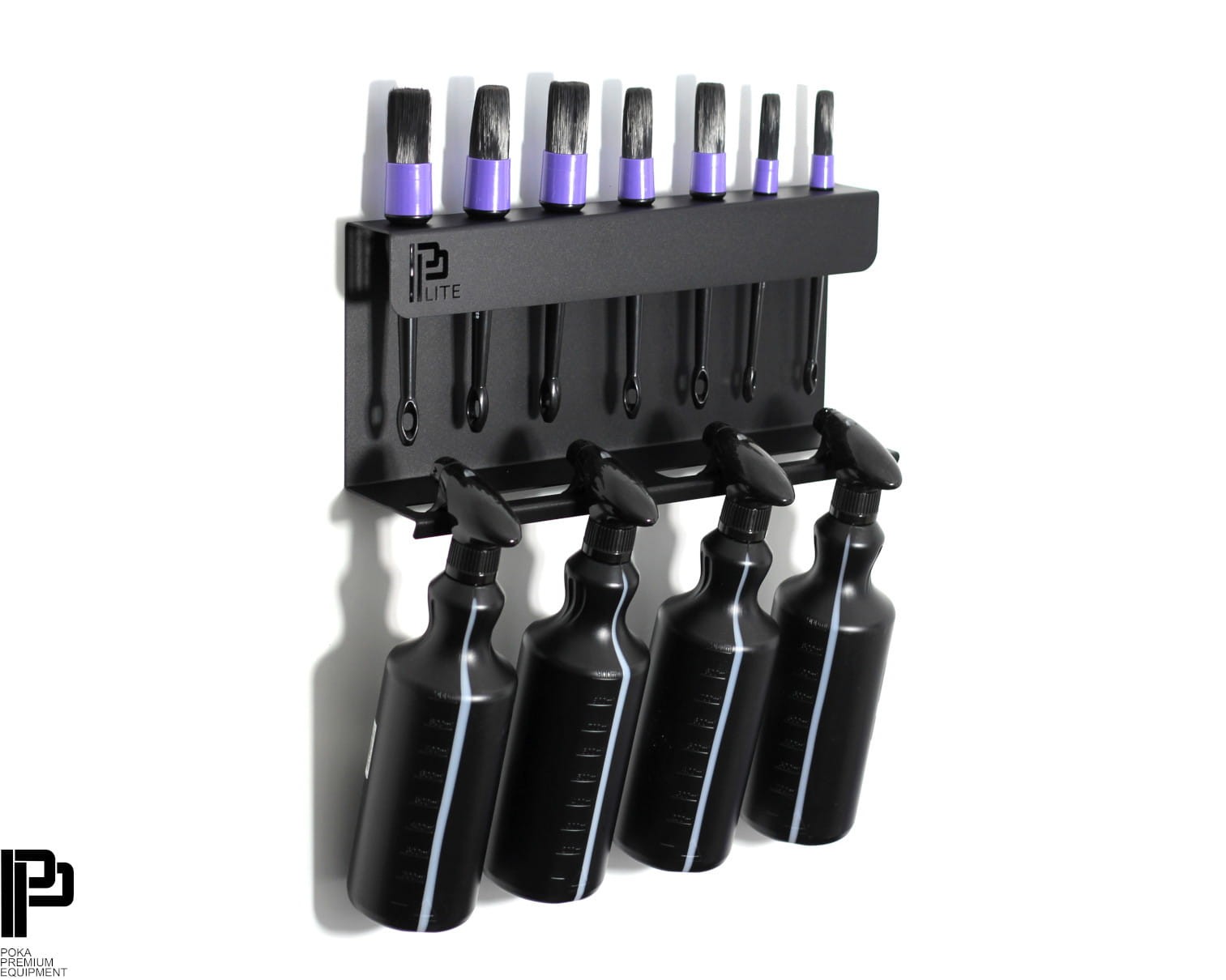 POKA Premium LITE představuje novou generaci držáků detailingového příslušenství, která spojuje nejvyšší kvalitu zpracování, moderní design a dlouhou životnost s atraktivnější cenou. Tato produktová řada je vyrobena ze stejné vysoce kvalitní konstrukční oceli jako prémiové modely. Je povrchově upravená odolným práškovým lakem pro maximální ochranu před poškozením a opotřebením – pouze bez pozinkované vrstvy, což umožňuje nabídnout skvělý poměr ceny a výkonu. Tento kovový držák pro 7 detailingových štětců a 4 lahve s rozprašovačem je dokonalým řešením pro každého detailera, který chce mít své vybavení vždy přehledně uložené, organizované a snadno dostupné. Díky preciznímu CNC zpracování je držák dokonale hladký a neobsahuje žádné ostré hrany, což zajišťuje maximální bezpečnost při každodenním používání. Práškové lakování s jemnou strukturou chrání povrch proti poškrábání, vyblednutí a korozi, zatímco čistý design a elegantní černé provedení zaručují, že se držák stane stylovým doplňkem každého detailingového studia, garáže nebo dílny.