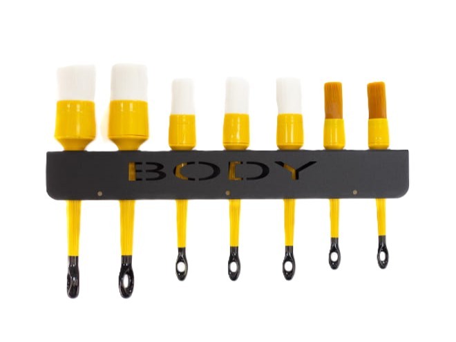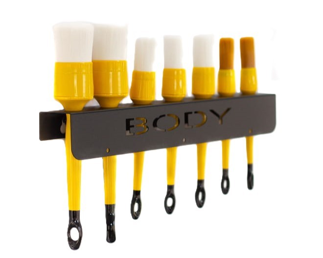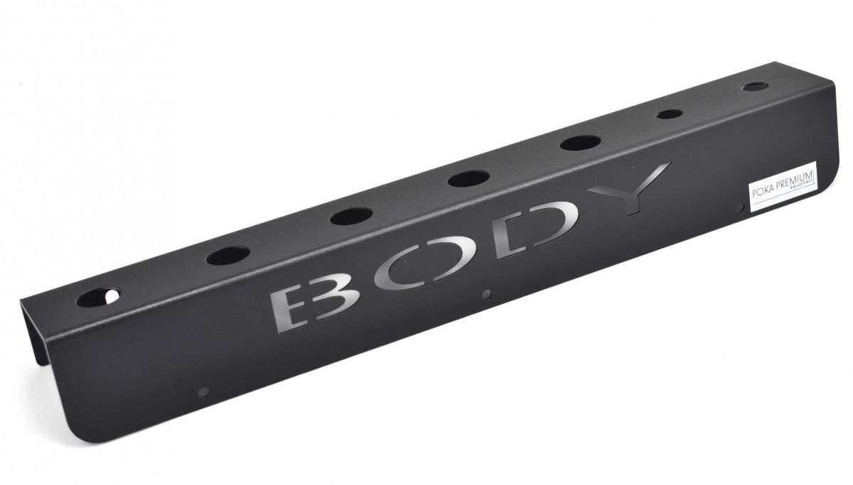 Poka Premium Holder for brush and car care accessories 40 cm - Body je univerzální masivní nástěnný držák pro 7 štětců pro detailing automobilu, který je praktický a funkční, má označení BODY. Otvory jsou vhodné pro většinu dostupných štětců na trhu. Montážní otvory pro přišroubování na zeď jsou umístěné v zadní části držáku, díky tomu zaručují naprostou stabilitu. Držák je vyroben z kvalitního kovu, který je lakován práškovou barvou, která chrání proti oxidaci. Z čelní strany je efektní řezané logo Poka Premium.