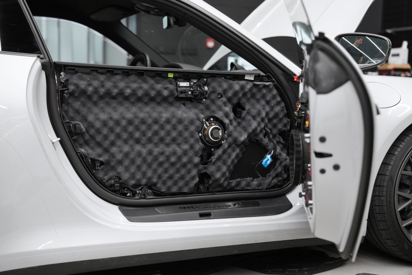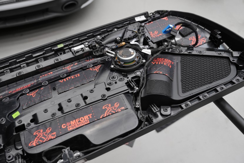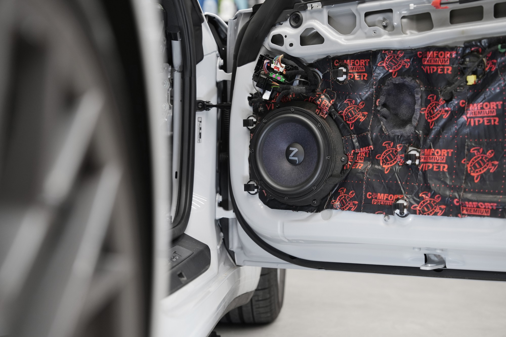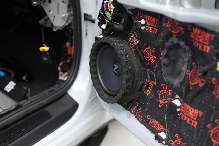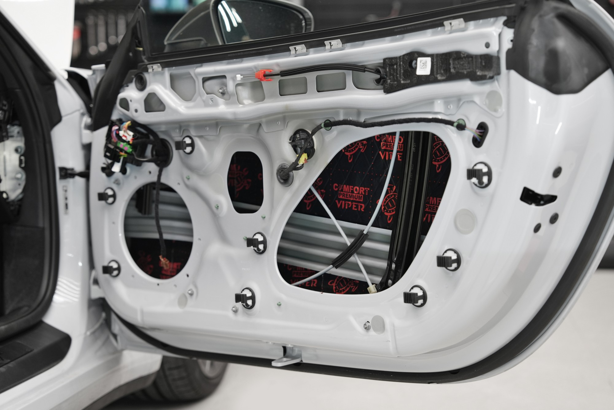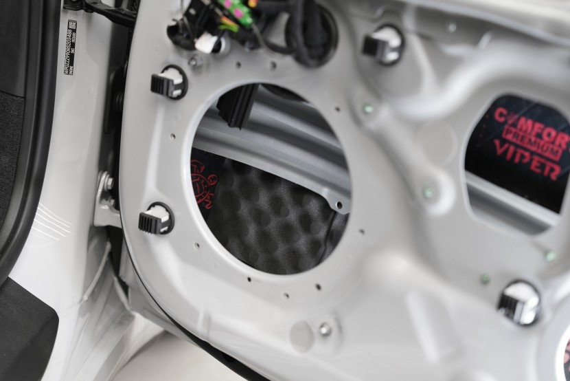 Pro zajištění optimálních akustických podmínek pro středobasové reproduktory jsme dveře adekvátně vytlumili, mysleli jsme však na nízkou hmotnost materiálů. V první fázi jsme aplikovali antivibrační materiál na vnější plech dveří, konkrétně jsme zvolili Comfortmat Viper o tloušťce 3 mm. I přes vyšší tloušťku a excelentní účinnost materiál disponuje velmi nízkou hmotností, což je u těchto typů automobilů na místě.