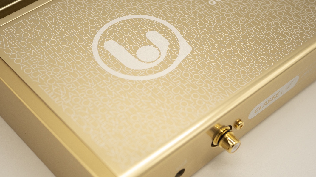 - Laserem gravírované šasi zesilovače ve zlaté barvě