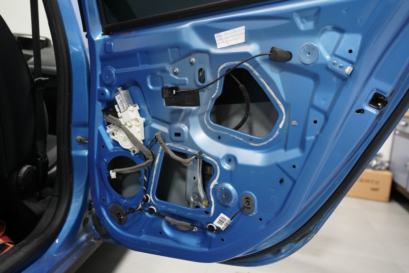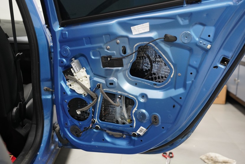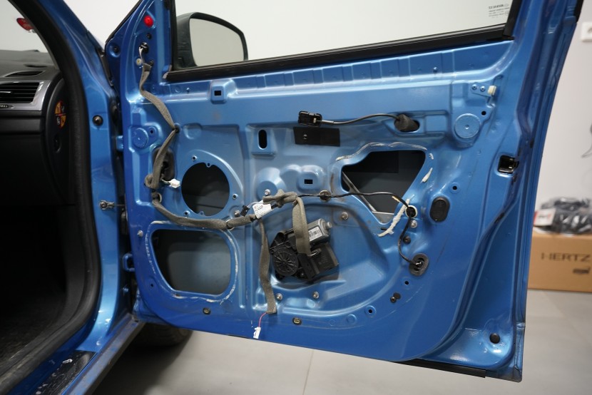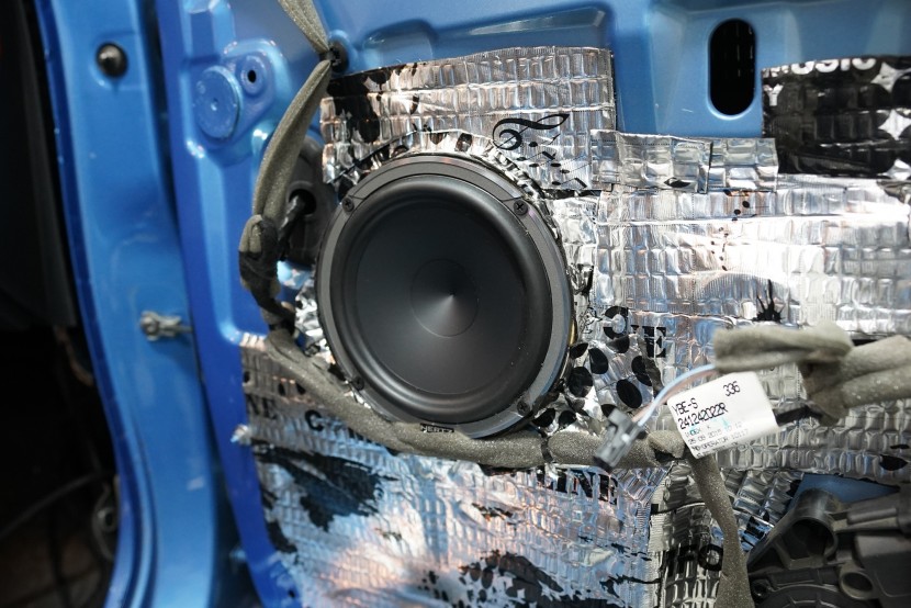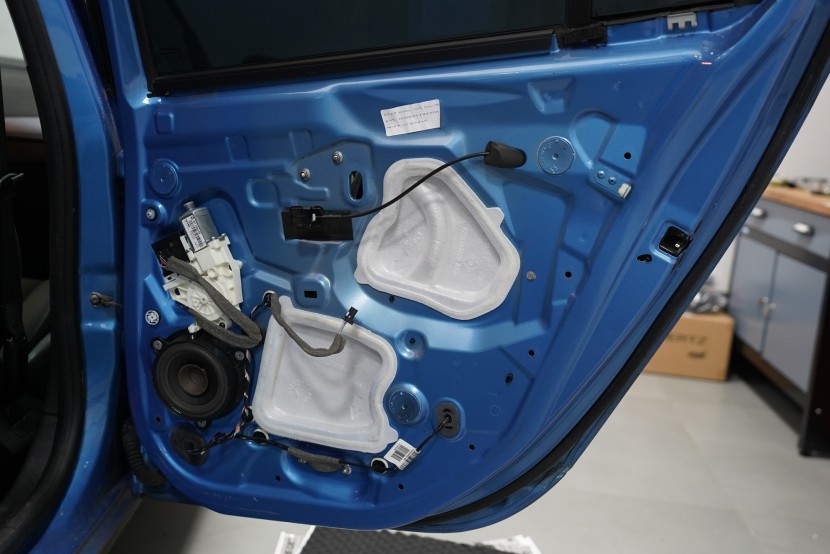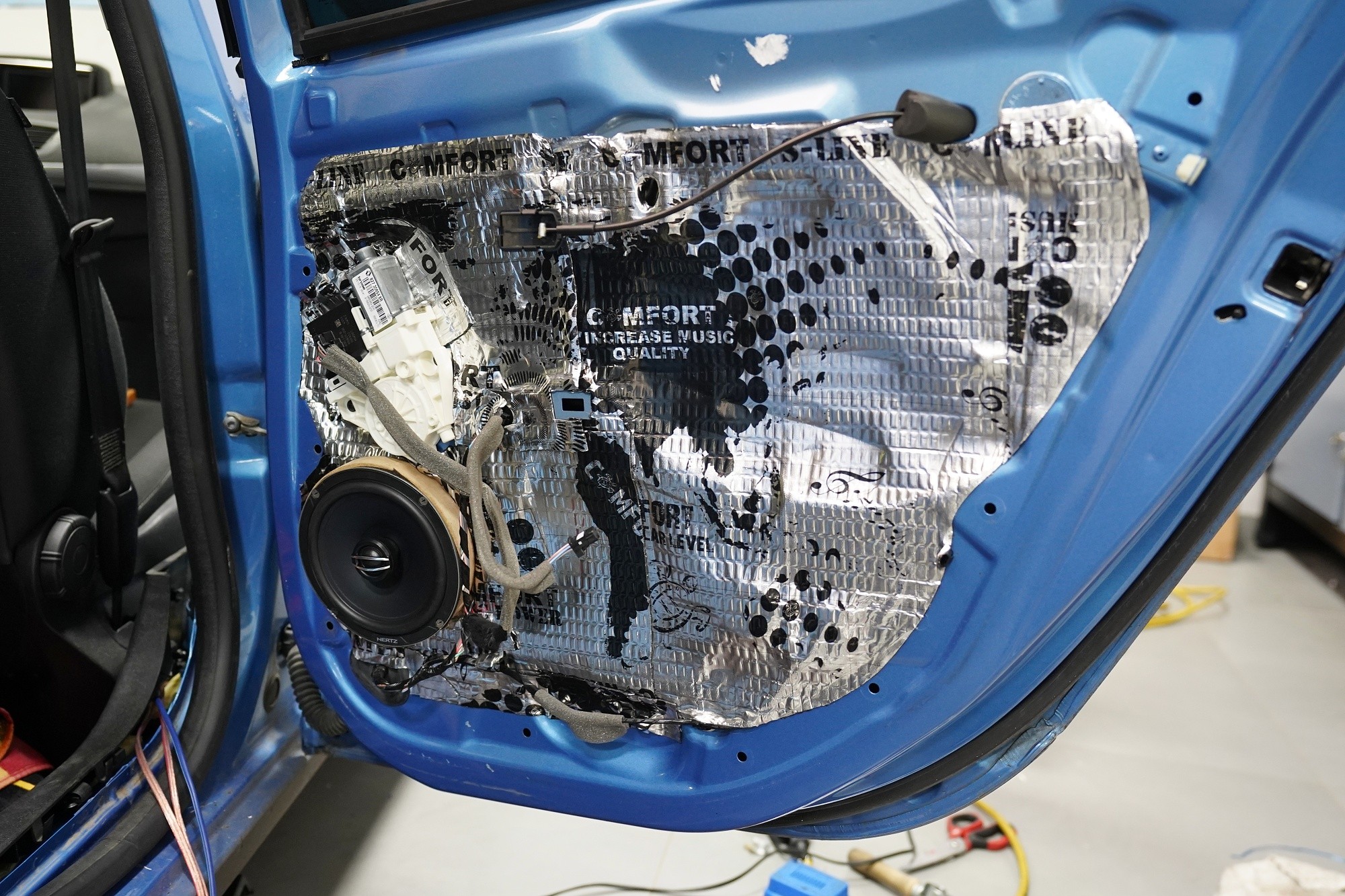 Další vrstvou je taktéž antivibrační materiál Comfortmat S2. Tato vrstva slouží k zamezení vibrací a rezonancí vnitřního plechu dveří a k vytvoření uzavřené ozvučnice pro reproduktory. Díky tomu dojde zejména ke zvýraznění basové složky nových reproduktorů. Stejný postup samozřejmě volíme i u zadních reproduktorů.
